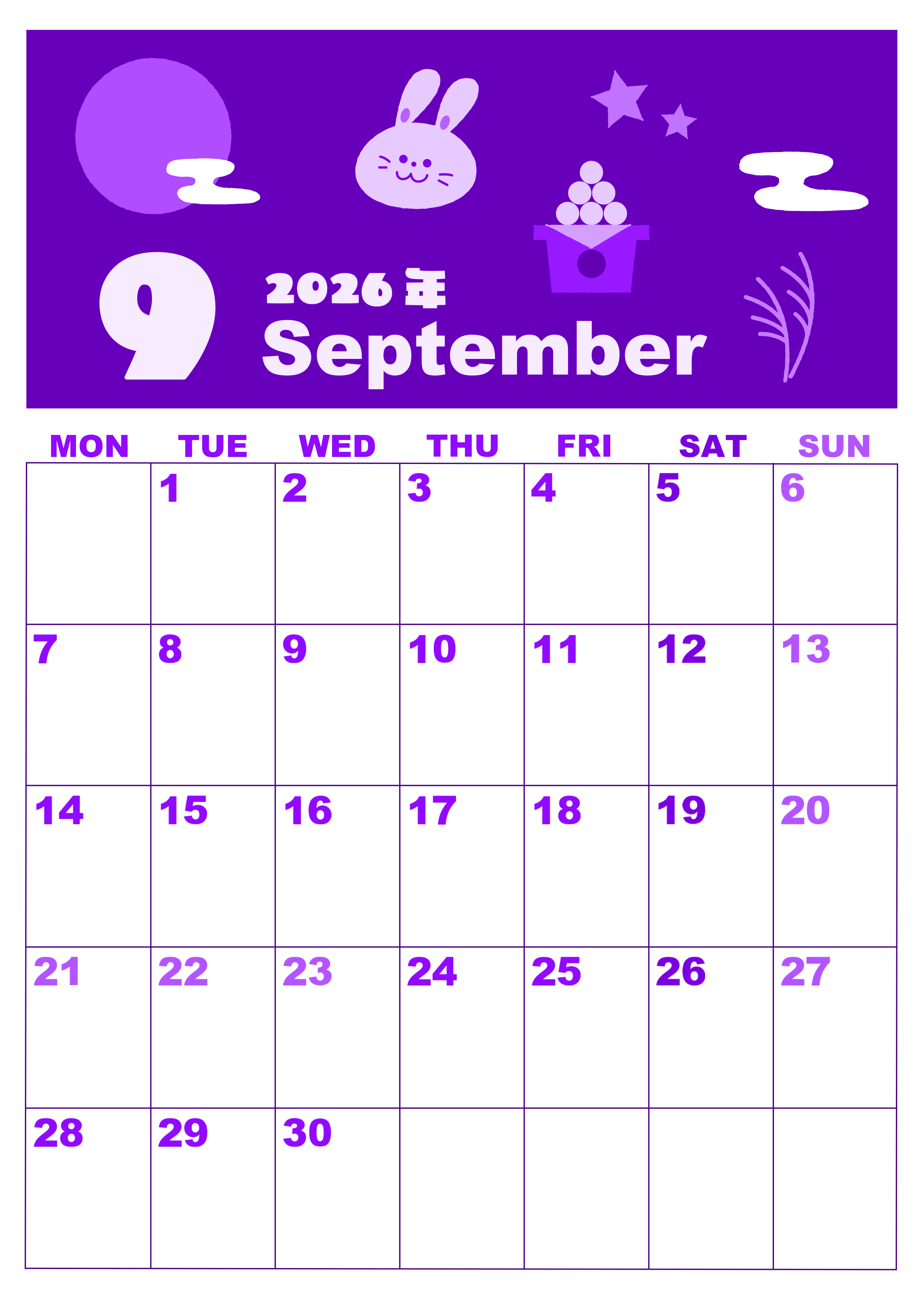 2026年9月縦型月曜始まりの無料テンプレートパープルのカレンダーです。文字の色分けがされているので予定管理にとても向いています。お月見をテーマに取り上げたイラストもかわいいので使うモチベーションが上がります。(2026-00980911)