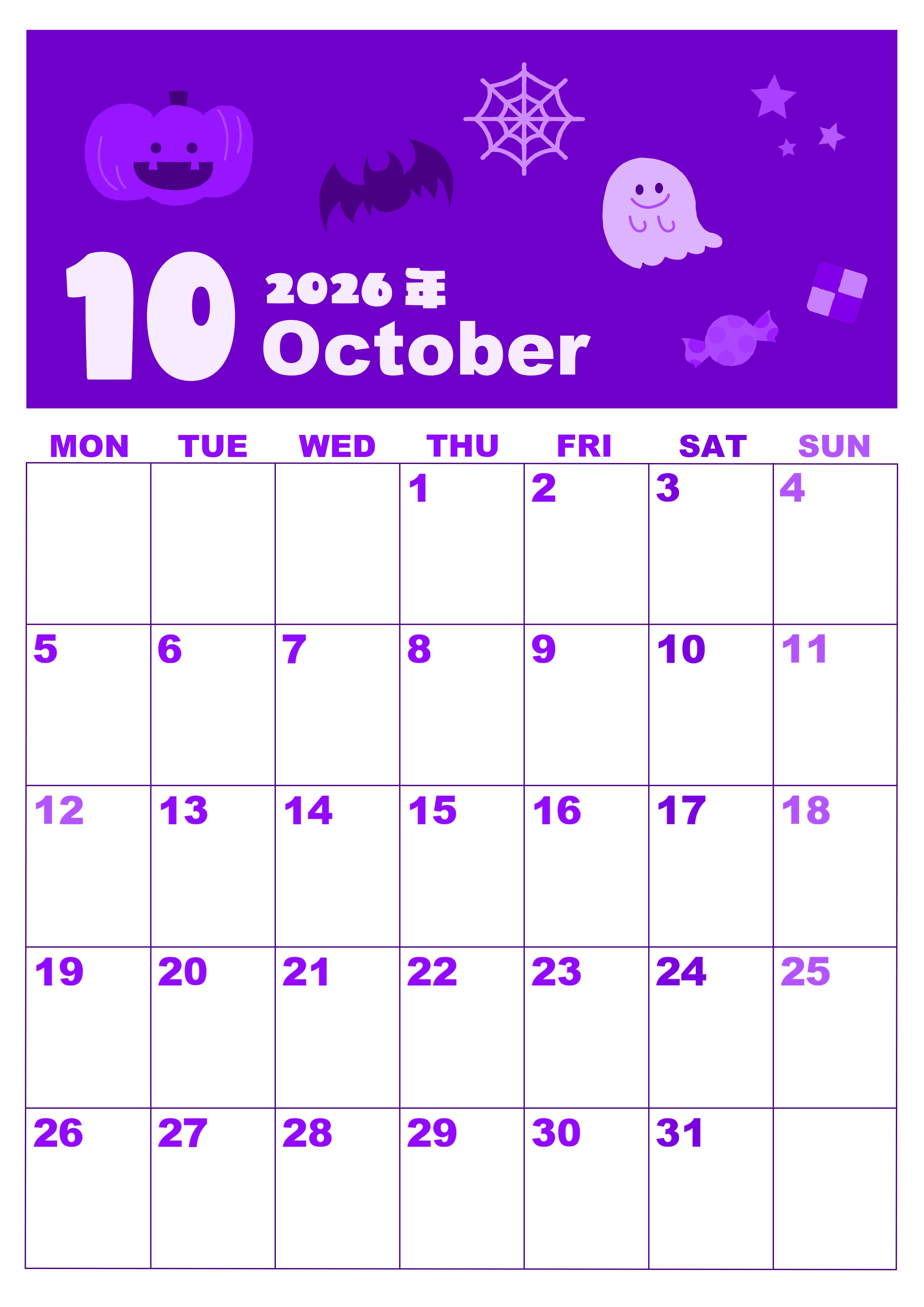2026年10月縦型月曜始まりの無料テンプレートパープルのカレンダーです。オバケとカボチャとお菓子を散りばめた遊び心満載でかわいいがぎっしり詰まったイラストに仕上がっています。(2026-00981011)