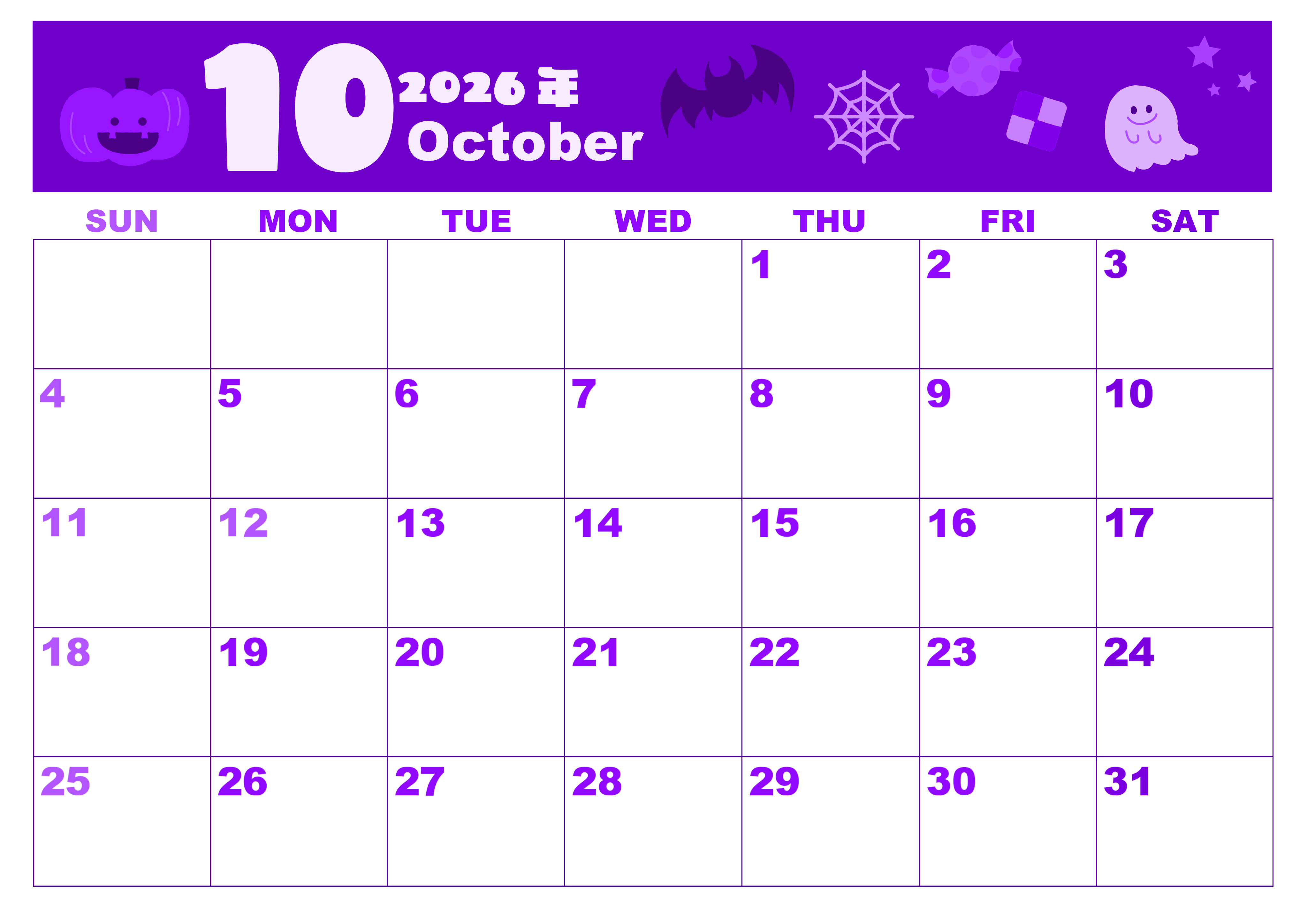 2026年10月横型日曜始まりの無料テンプレートパープルのカレンダーです。ハロウィンといえばトリックオアトリート!とお菓子を子供たちにせがまれます。そんなお菓子を描いたかわいいイラストとなっています。(2026-00981000)