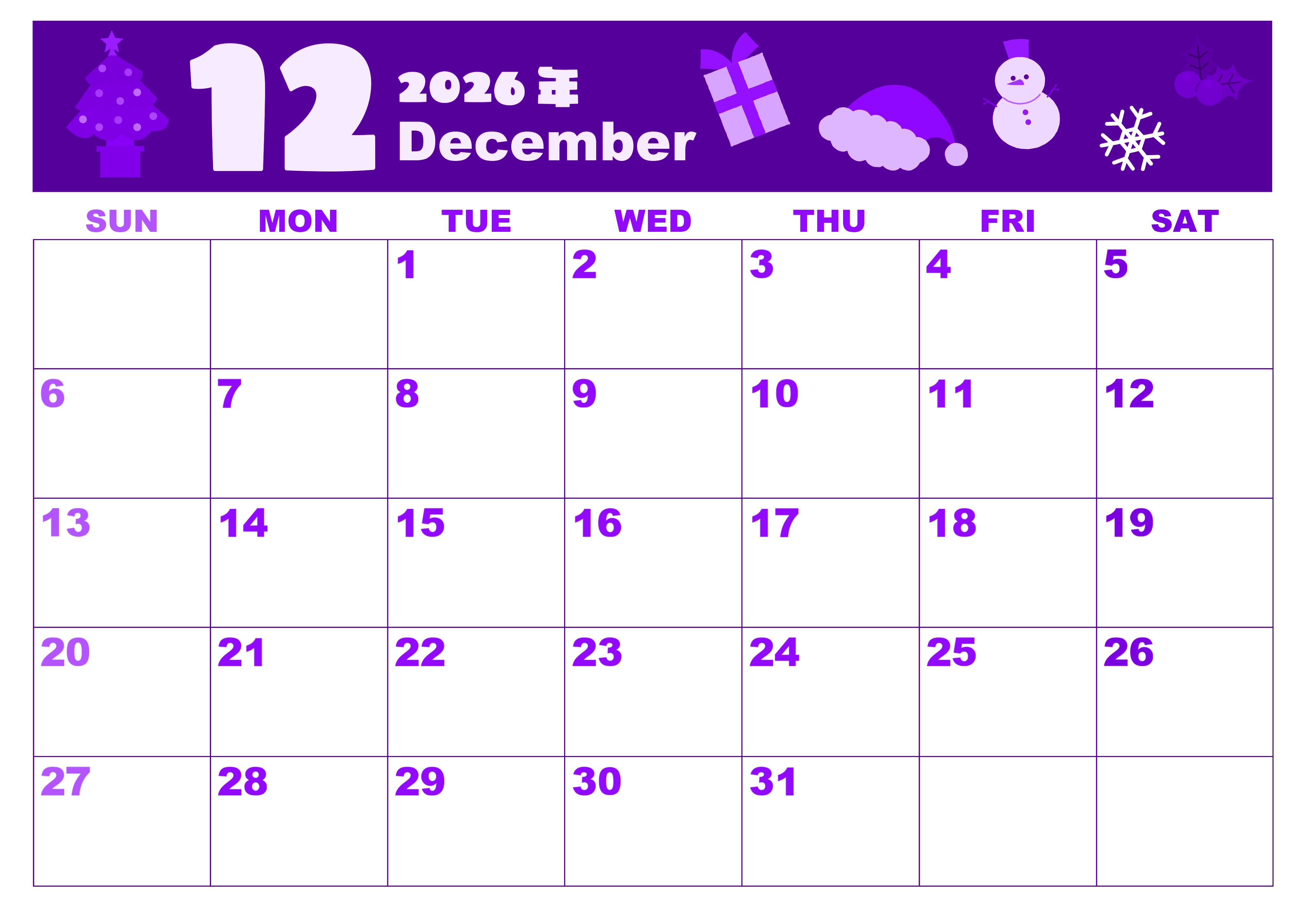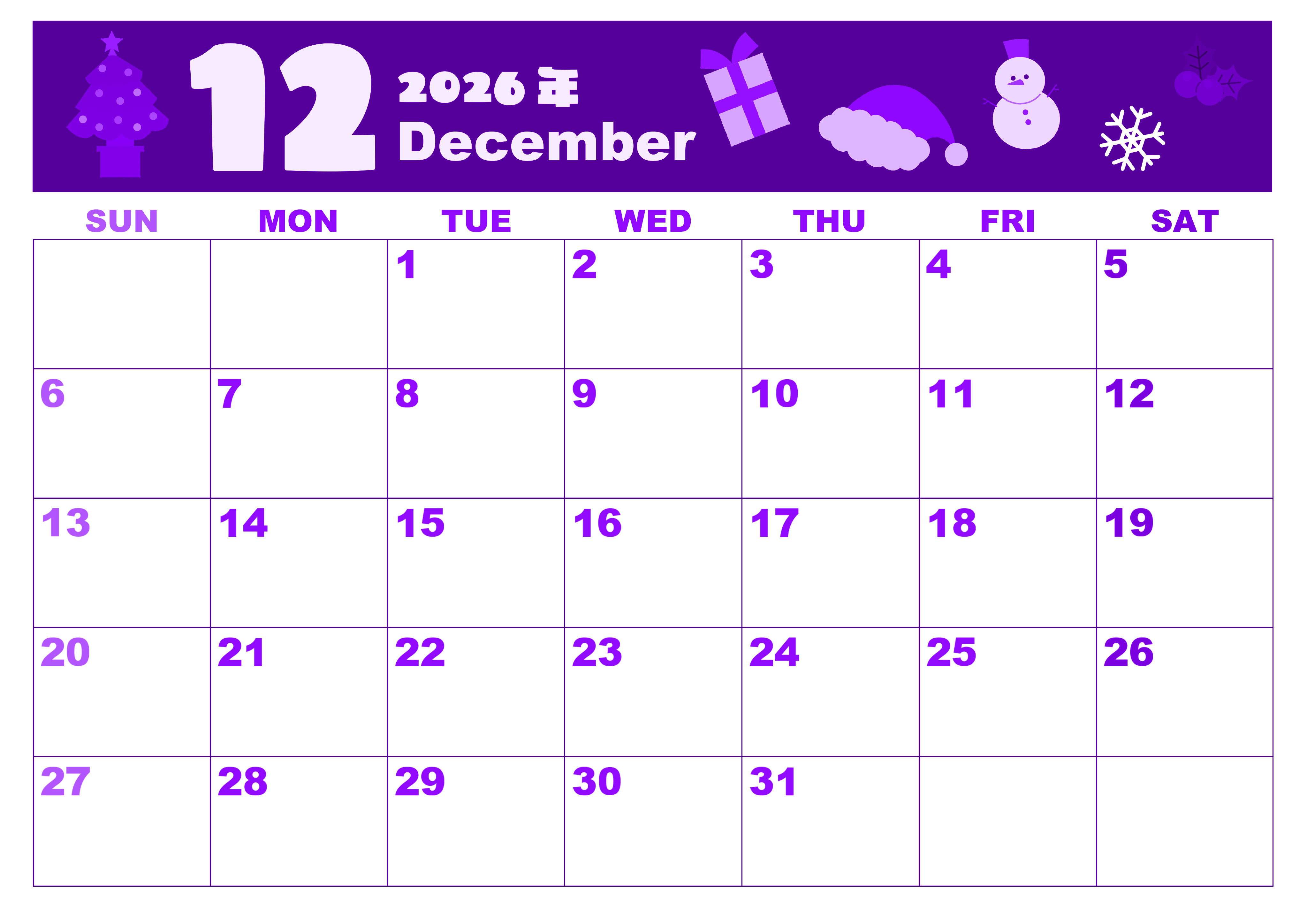 2026年12月横型日曜始まりの無料テンプレートパープルのカレンダーです。行事にまつわるアイテムがあちこちにちりばめられているかわいいイラストに仕上げました。フォントもかわいいところがおすすめです。(2026-00981200)