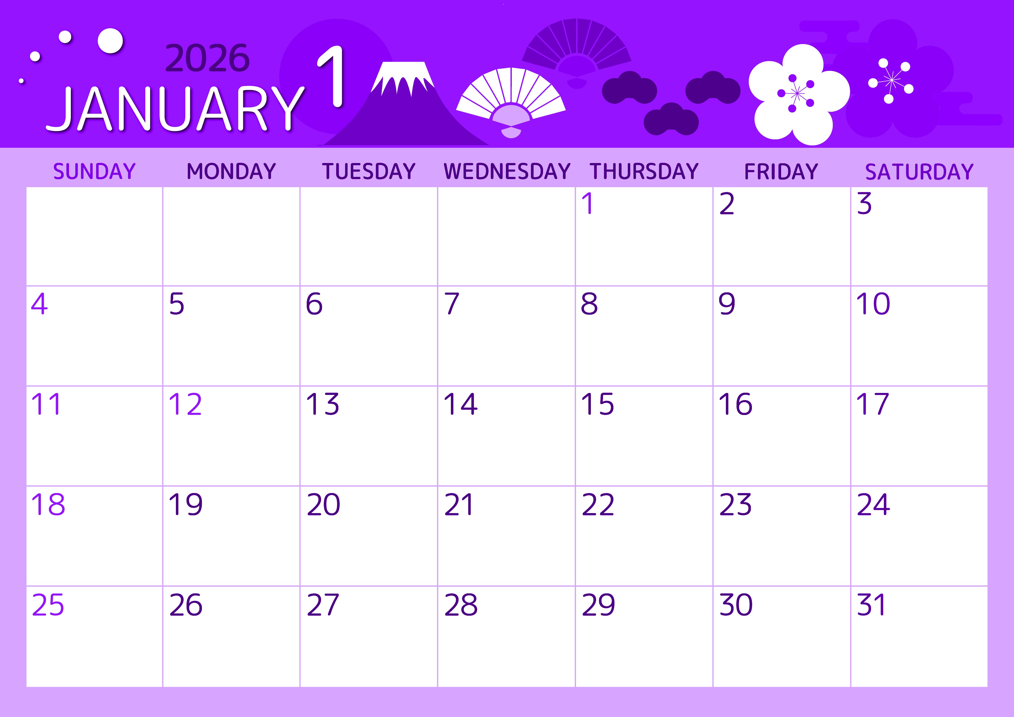 2026年1月横型日曜始まりパープルのカレンダーです。和風ではっきりとしたデザインのかわいいイラストと罫線で構成されているパープルのカレンダーです。曜日によって色分けがされているので使い勝手も良いです。各項目が大きめの余白を設けているので予定を書き込みやすいです。(2026-00990100)