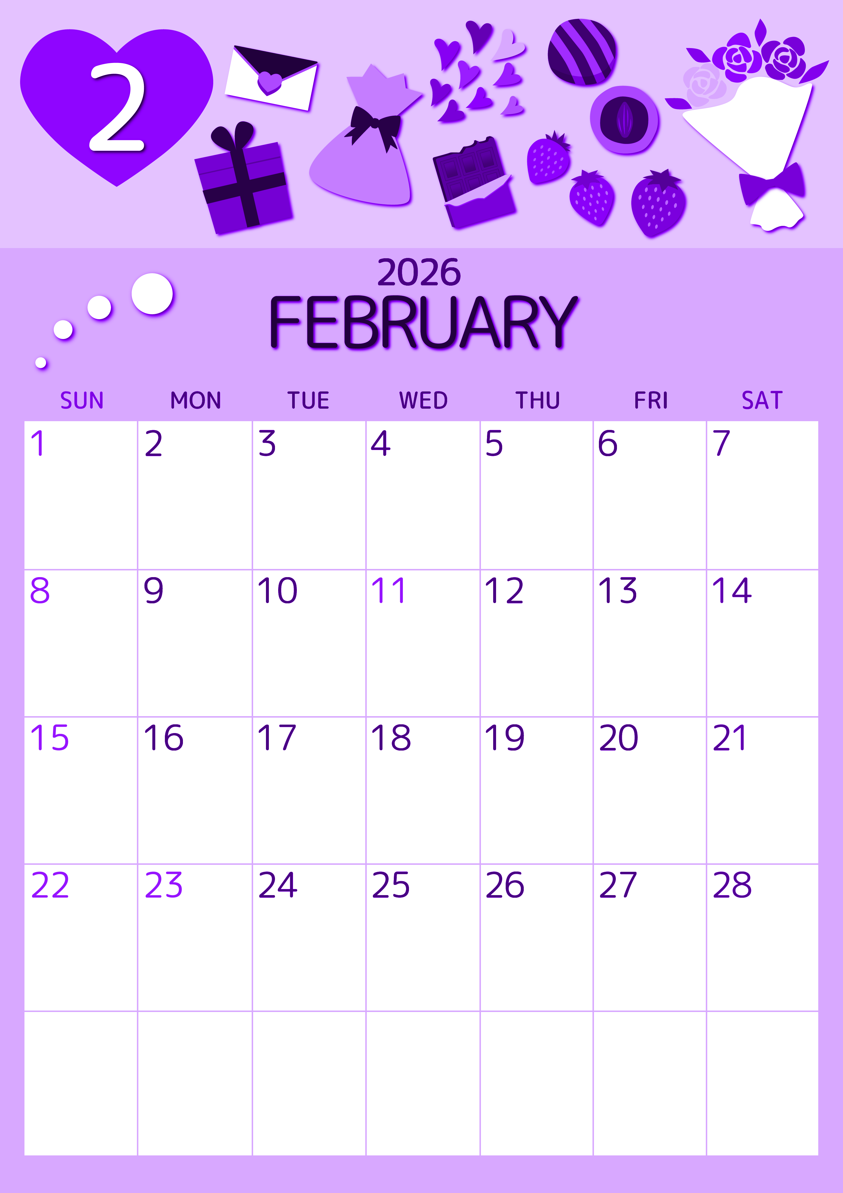 2026年・無料のカレンダーテンプレート 2026年2月縦型日曜始まり プレゼントがかわいいイラストA4無料パープルのカレンダー(2026-00990210) 素材状デザイン王 2025年4月6日 2026年2月縦型日曜始まりの無料テンプレートパープルのカレンダーです。ハートの中に2月の文字があるかわいい遊び心たっぷりのパープルのカレンダーです。縦型なので壁に貼って利用しやすいサイズ感です。(2026-00990210) 2月 縦型のカレンダー 日曜始まり パープル カレンダーデザイン-0099