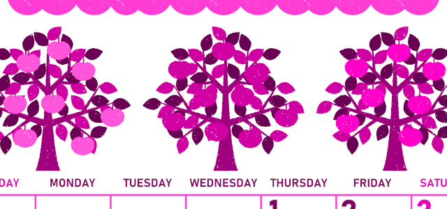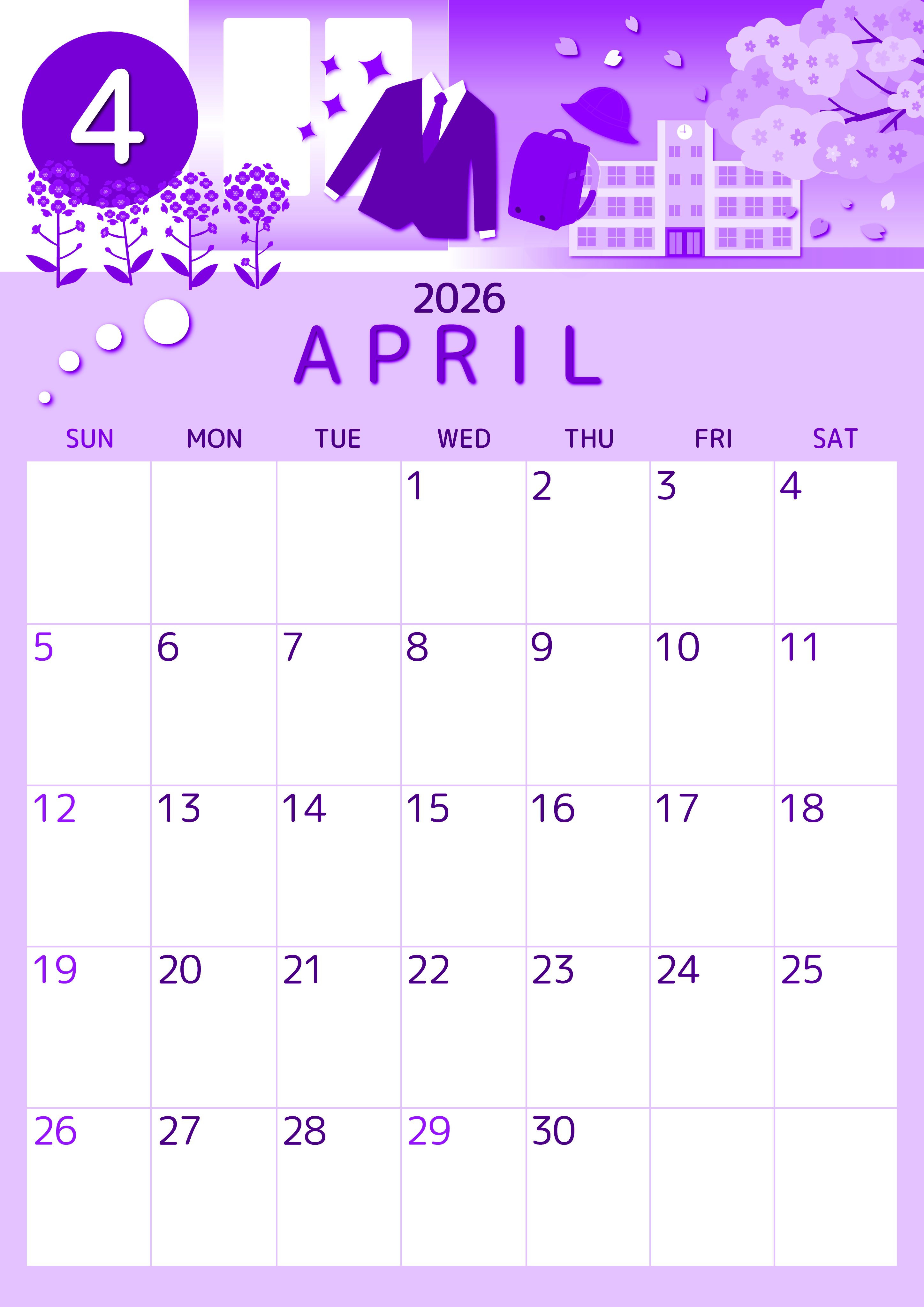2026年4月縦型日曜始まりの無料テンプレートパープルのカレンダーです。入学式だとわかるような学校や桜の木がいっぱいのかわいいイラストパープルのカレンダーです。シンプルな罫線なのでスケジュール管理に向いています。(2026-00990410)