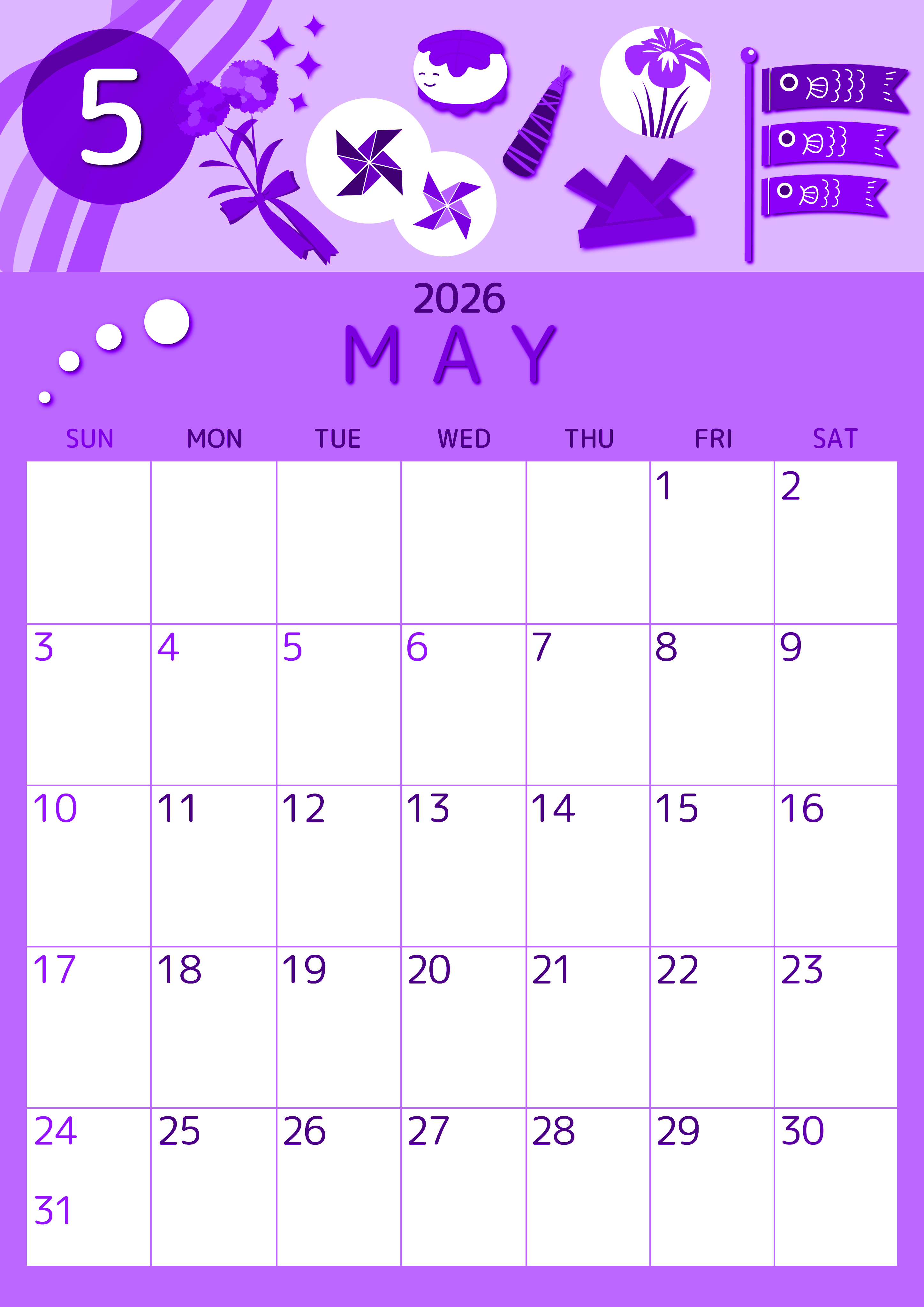 2026年5月縦型日曜始まり イベントイラストのかわいいA4無料パープルのカレンダー(2026-00990510)