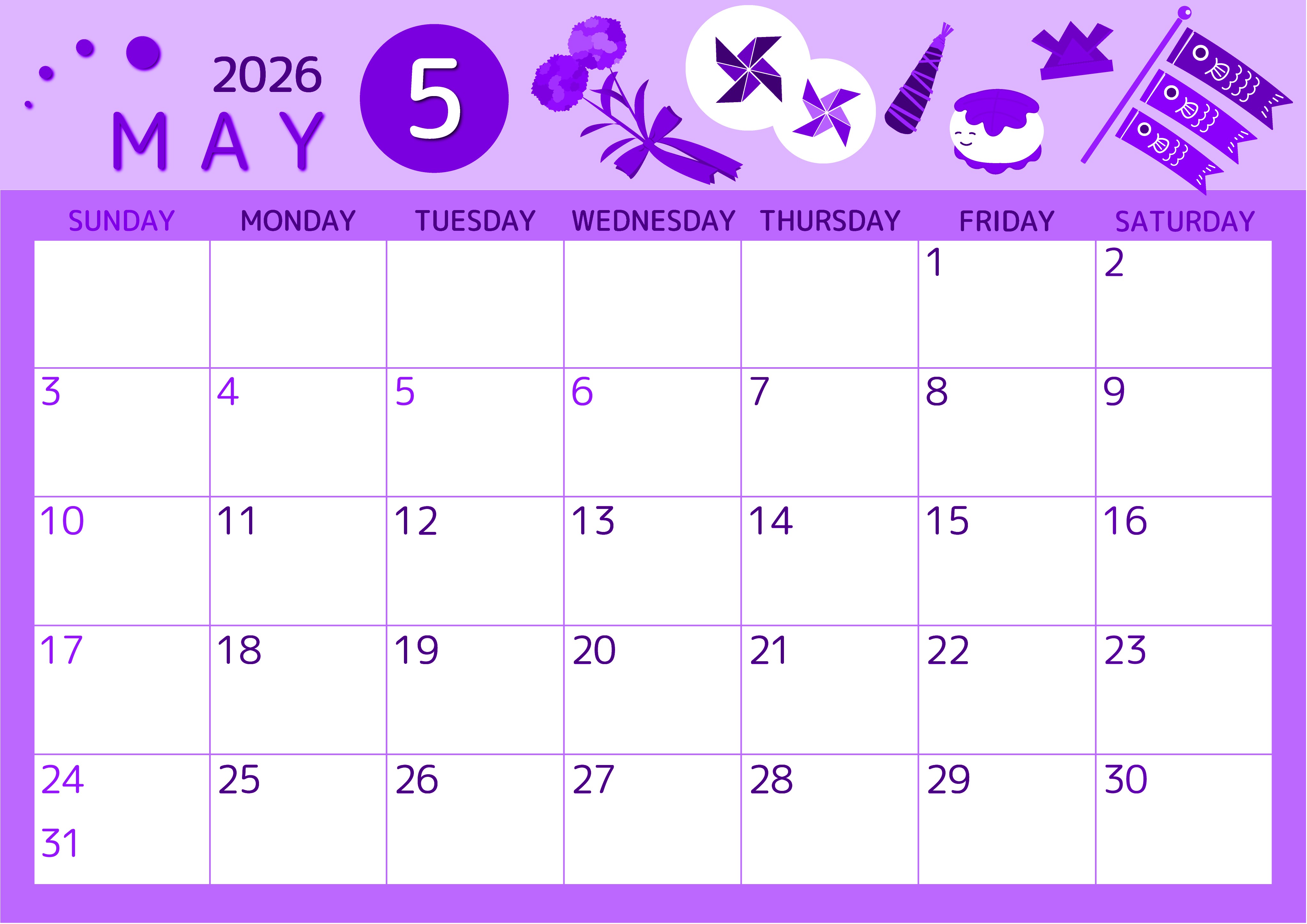 2026年5月横型日曜始まりの無料テンプレートパープルのカレンダーです。5月は沢山のイベントが控えています。ゴールデンウィーク、母の日、子供の日…。わくわくな気持ちにさせてくれるようなかわいいイラストパープルのカレンダーです。(2026-00990500)