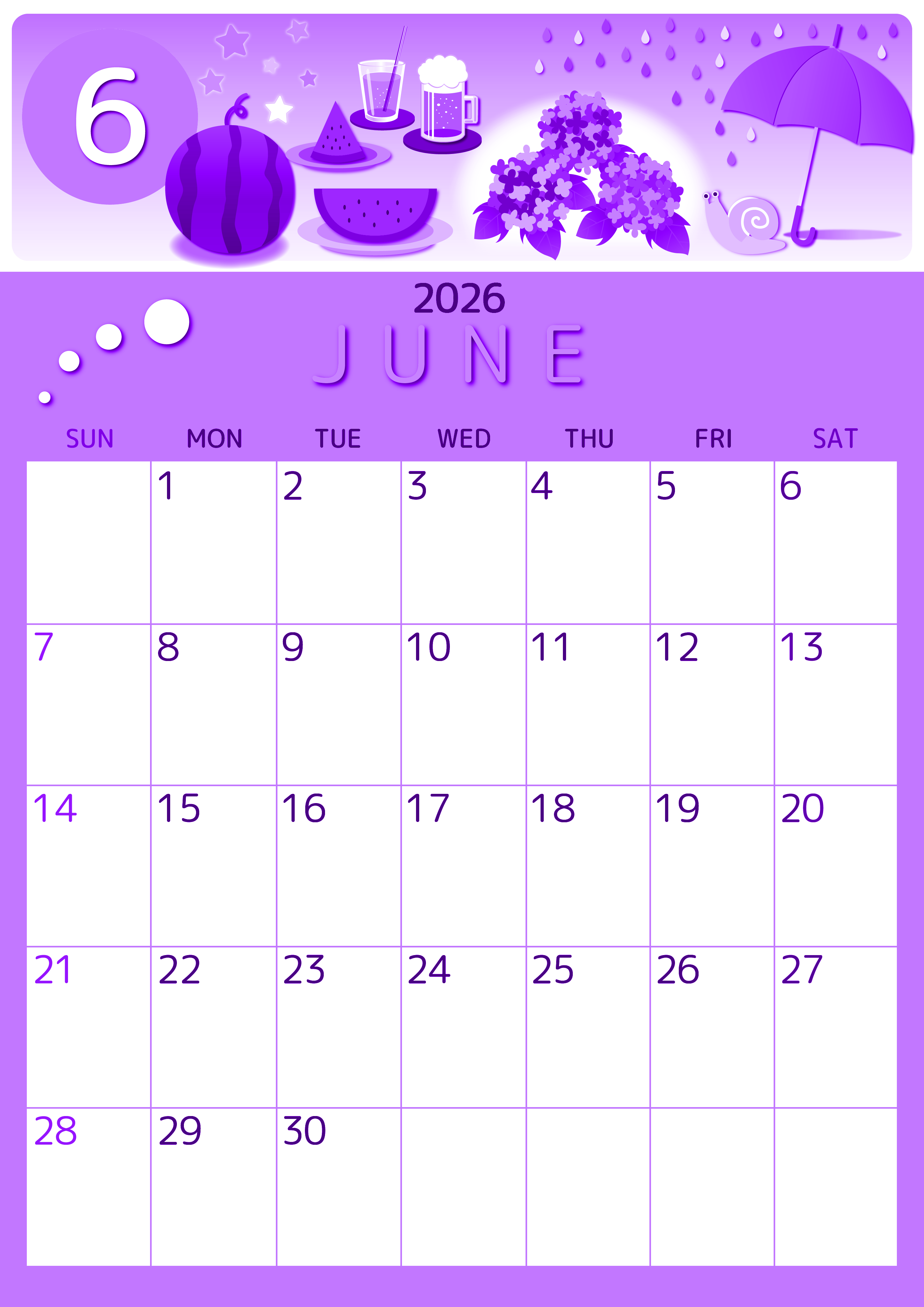 2026年6月縦型日曜始まりの無料テンプレートパープルのカレンダーです。すいかのシンプルでかわいいイラストが夏の始まりを感じさせてくれる見やすい使いやすいパープルのカレンダーはダウンロードが無料で行えます。(2026-00990610)