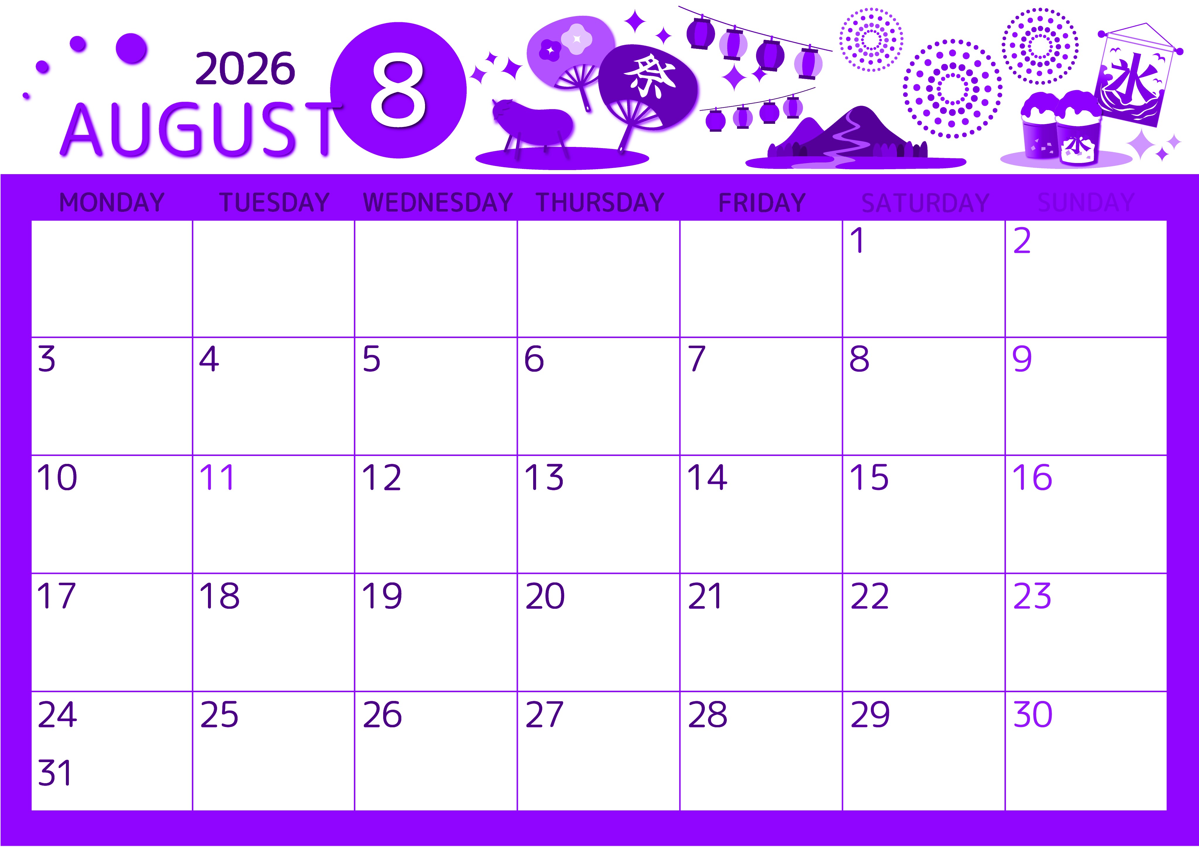 2026年8月横型月曜始まりの無料テンプレートパープルのカレンダーです。月曜始まりで曜日ごとに色分けがされている利便性が高いパープルのカレンダーです。かわいいイラストのテーマは夏祭りで賑やかさが伝わってくるような雰囲気です。(2026-00990801)