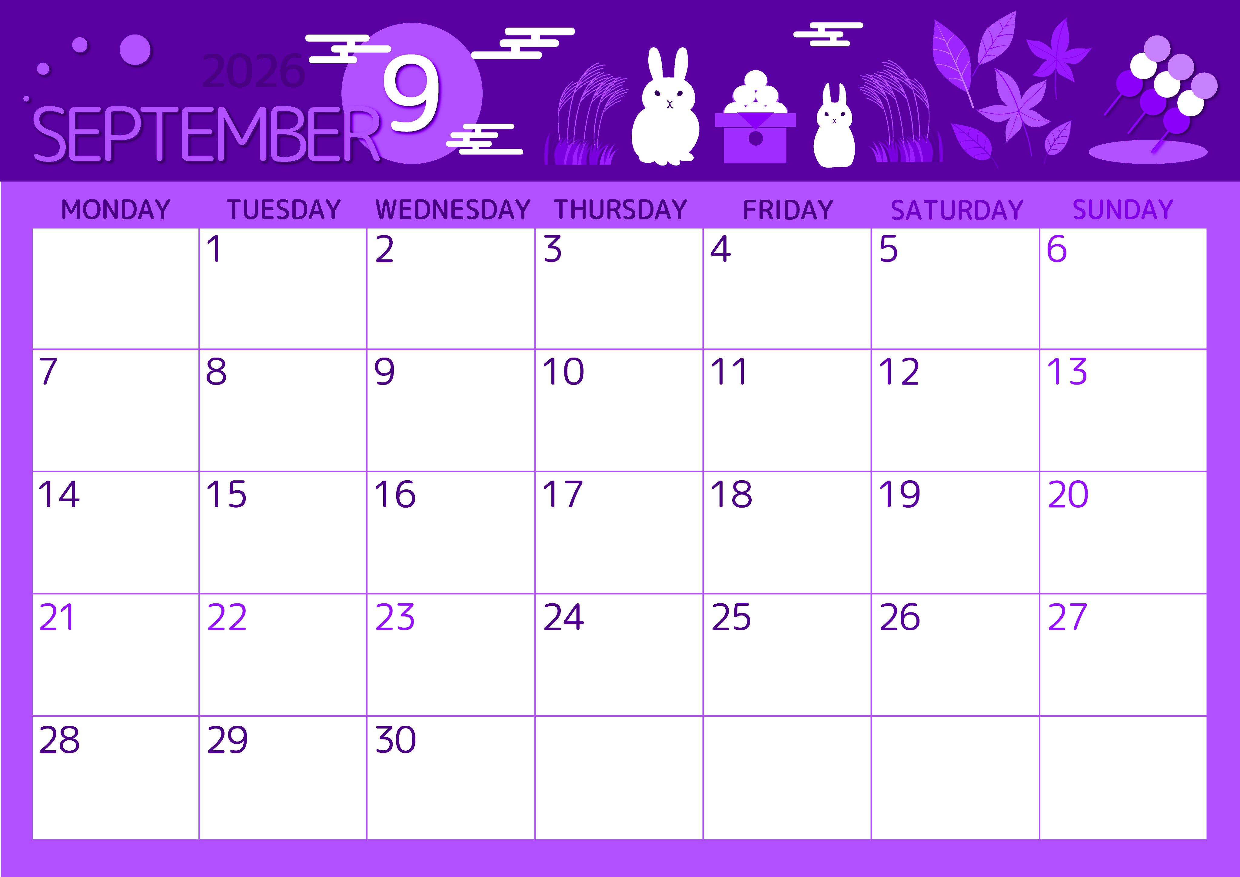 2026年9月横型月曜始まり 十五夜イラストのかわいいA4無料パープルのカレンダー(2026-00990901)