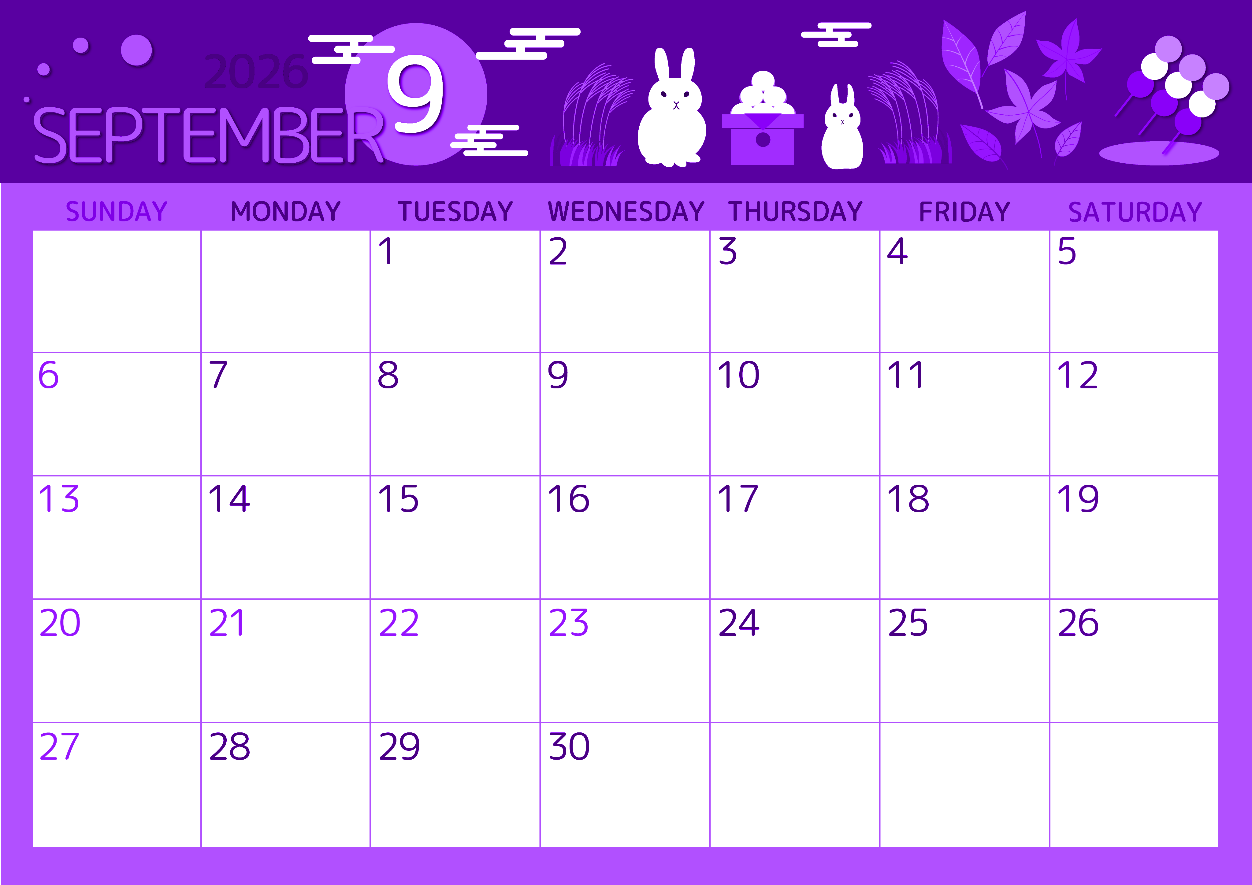 2026年9月横型日曜始まりの無料テンプレートパープルのカレンダーです。十五夜の様子を非常に賑やかに細かく書き上げたかわいいイラストにパープルのカレンダー部分をフレーミングしたとてもかわいいデザインです。(2026-00990900)