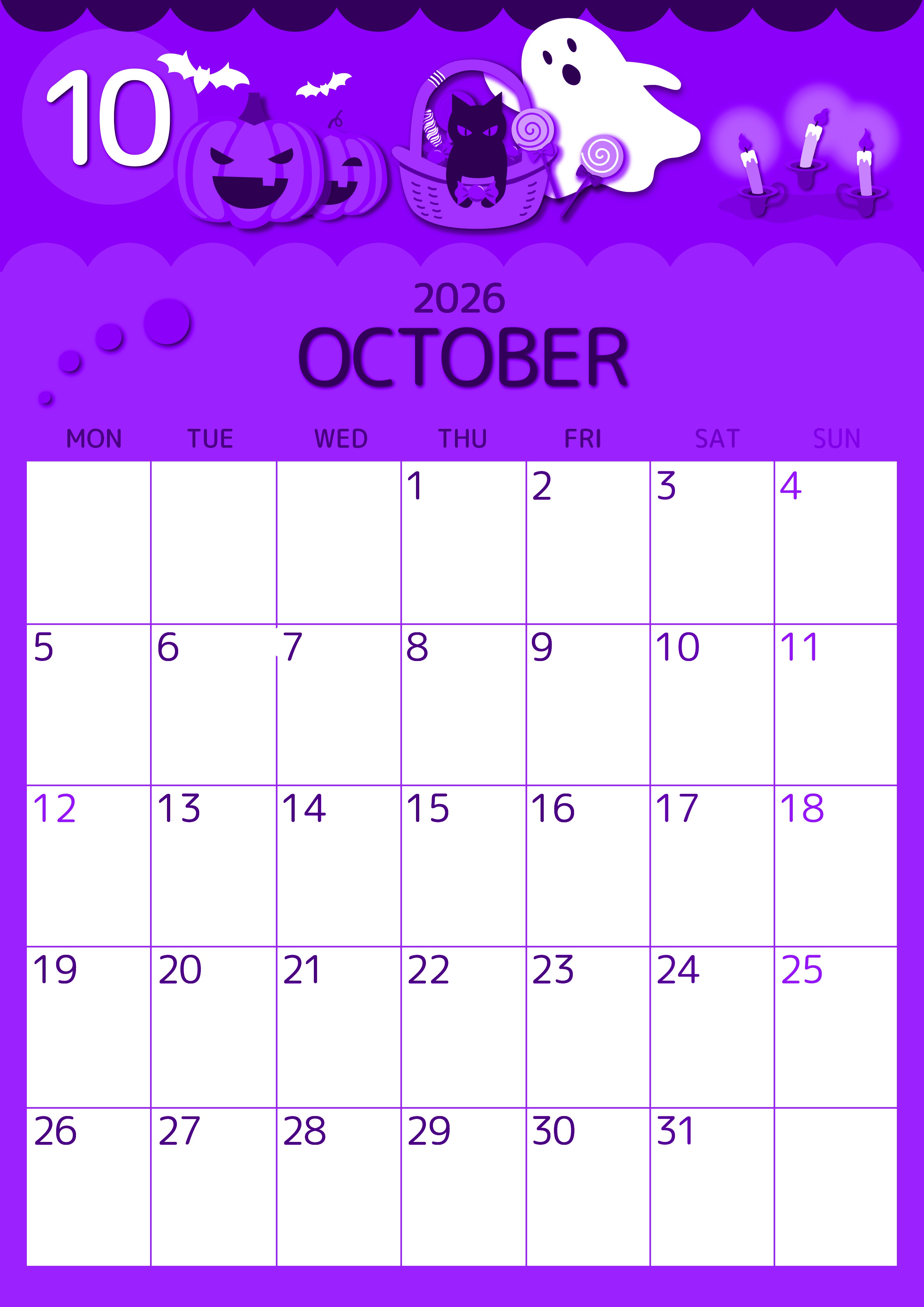 2026年・無料のカレンダーテンプレート 2026年10月縦型月曜始まり 行事イラストのかわいいA4無料パープルのカレンダー(2026-00991011) 素材状デザイン王 2025年4月6日 2026年10月縦型月曜始まりの無料テンプレートパープルのカレンダーです。罫線がはっきり惹かれていて曜日ごとに文字の色分けをしているので見やすいです。行事に関するイラスト部分もかわいいです。(2026-00991011) 10月 縦型のカレンダー 月曜始まり パープル カレンダーデザイン-0099