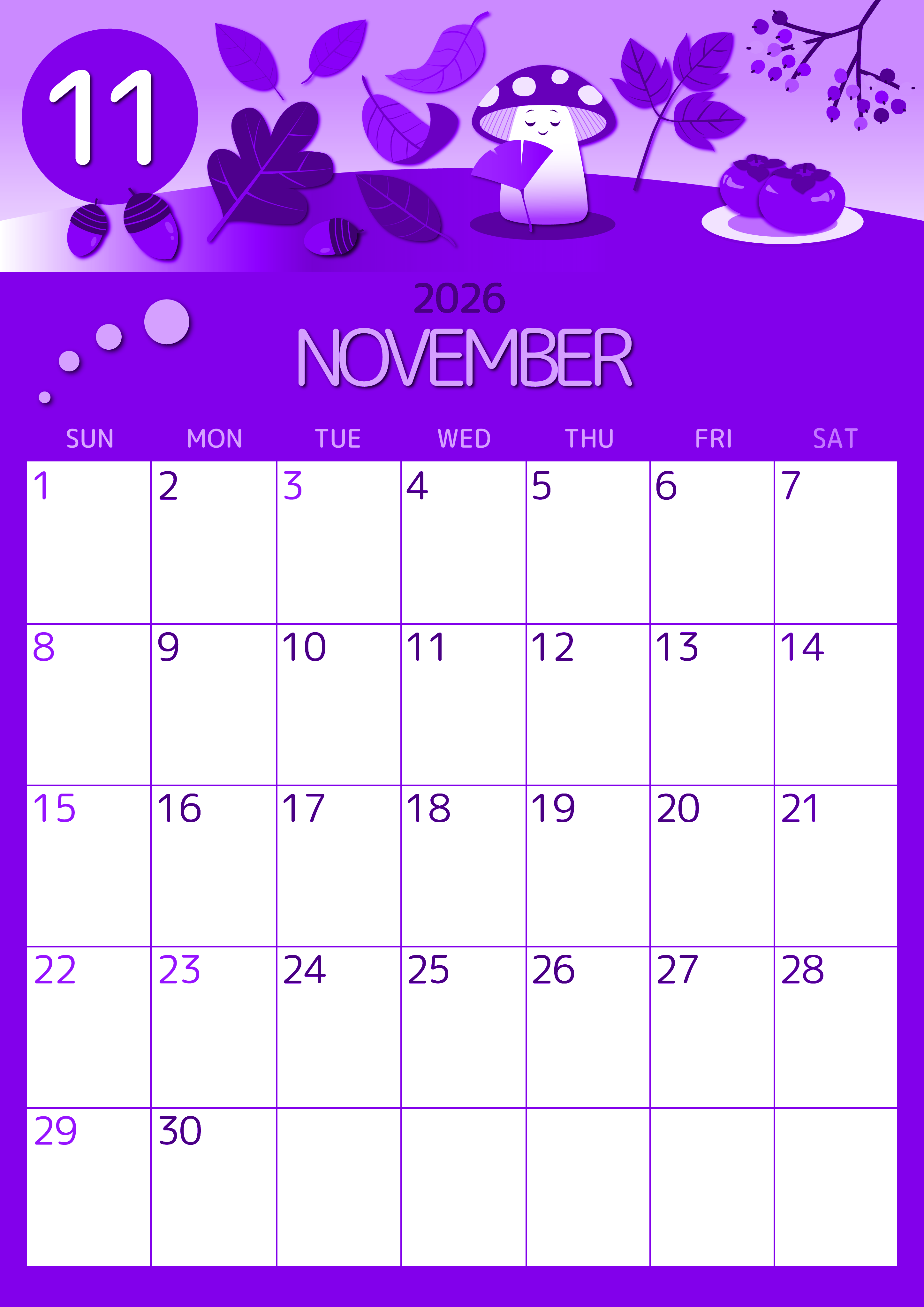2026年・無料のカレンダーテンプレート 2026年11月縦型日曜始まり きのこイラストのかわいいA4無料パープルのカレンダー(2026-00991110) 素材状デザイン王 2025年4月6日 2026年11月縦型日曜始まりの無料テンプレートパープルのカレンダーです。もみじやいちょうにかこまれて休憩をしているきのこのイラストがとてもかわいいです。縦向きで印刷をするだけですぐ使えます。(2026-00991110) 11月 縦型のカレンダー 日曜始まり パープル カレンダーデザイン-0099