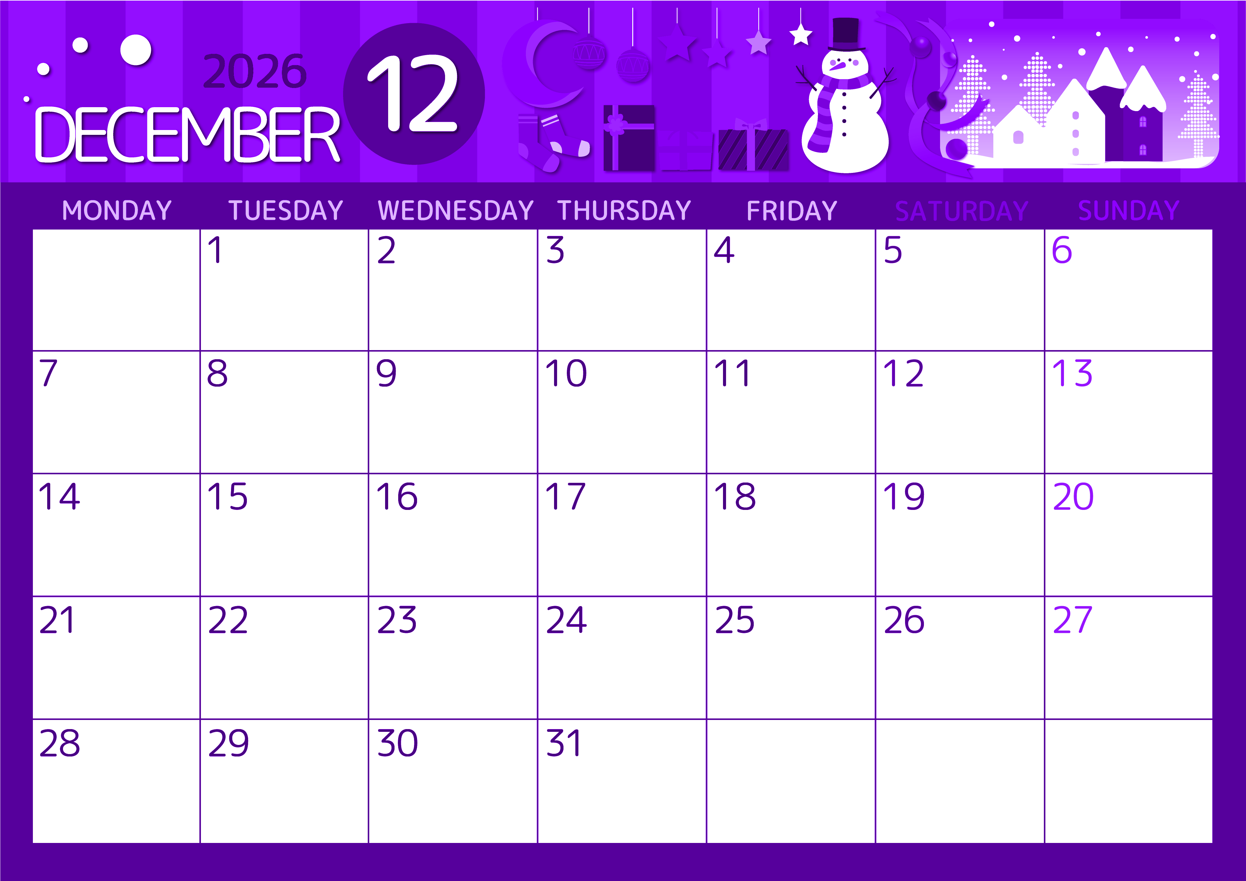 2026年12月横型月曜始まりの無料テンプレートパープルのカレンダーです。雪だるまの白色が背景の赤色にばっちり映えるかわいいテイストが強いイラストになっています。雪景色のイラストもメリハリがあって美しいです。(2026-00991201)