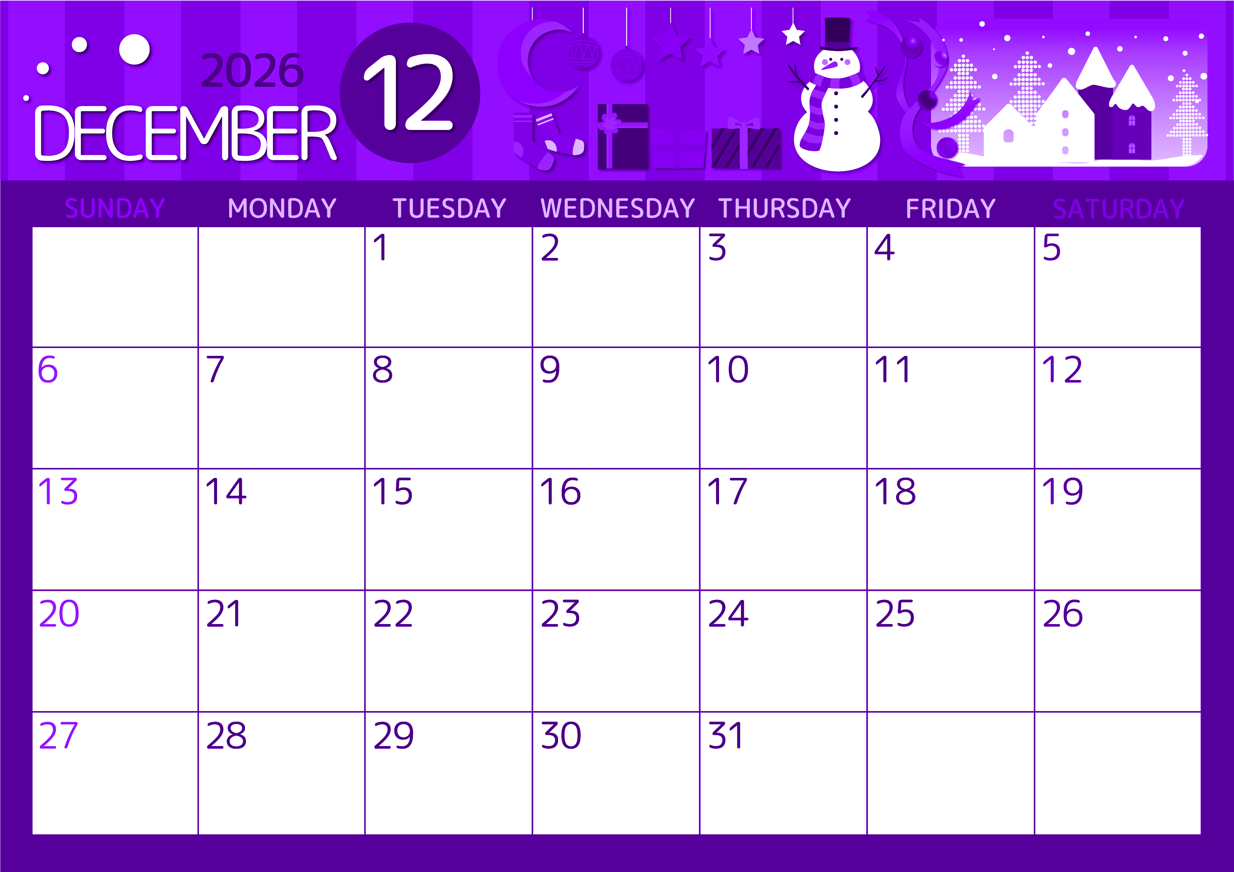 2026年・無料のカレンダーテンプレート 2026年12月横型日曜始まり 雪だるまイラストのかわいいA4無料パープルのカレンダー(2026-00991200) 素材状デザイン王 2025年4月6日 2026年12月横型日曜始まりの無料テンプレートパープルのカレンダーです。雪だるまが主役のイラストです。パープルのカレンダー上部は鮮やかな赤色でコントラストがかわいいです。(2026-00991200) 12月 横型のカレンダー 日曜始まり パープル カレンダーデザイン-0099