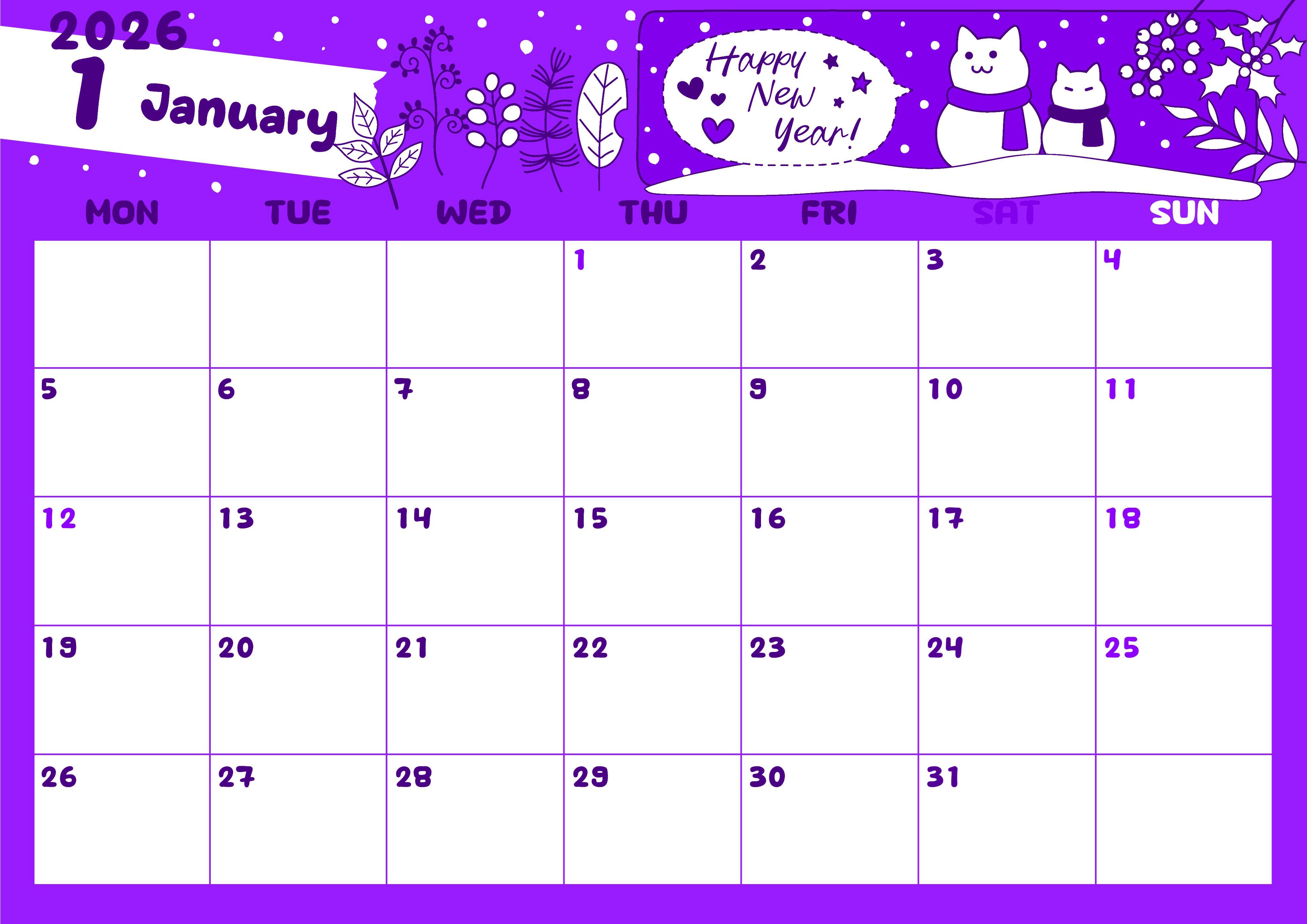 2026年1月横型月曜始まりです。ボタニカルなリーフがモノトーンでパープルのカレンダー上部中央にあり、その右側には寄り添ったネコ型雪だるまが2体ちょこんと座っているようなかわいいオリジナルパープルのカレンダーです。ユニークなフリー素材です。(2026-01000101)