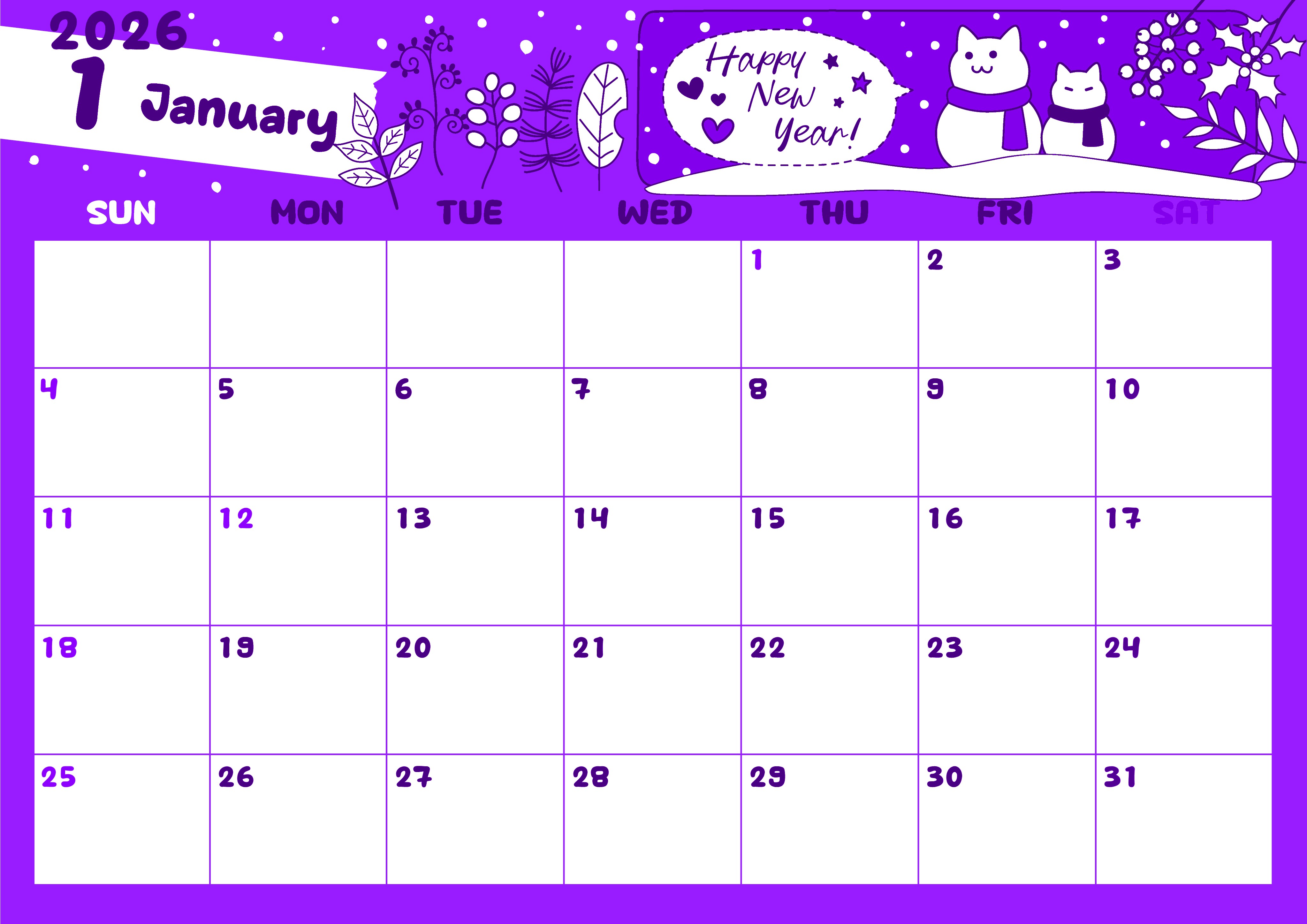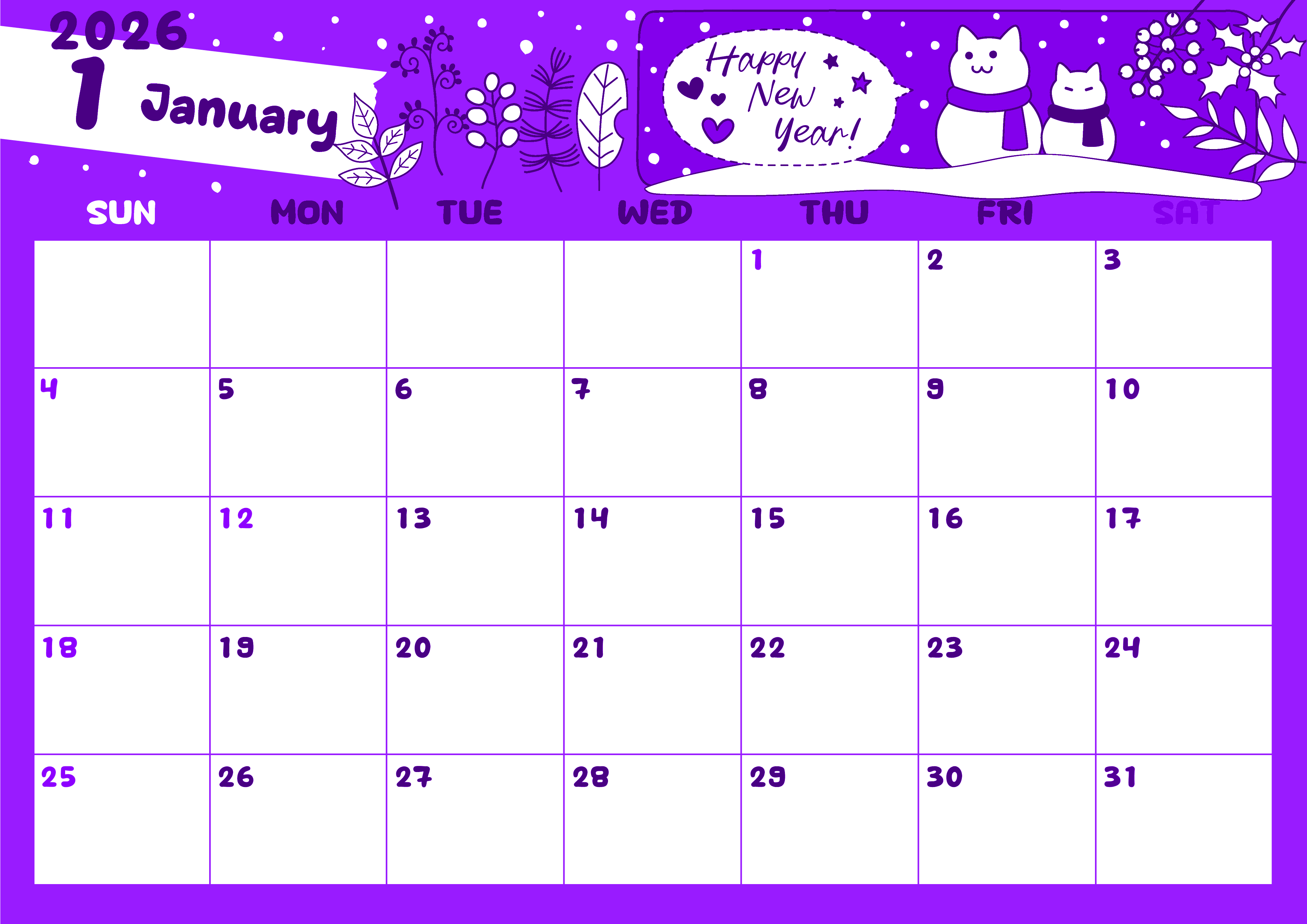 2026年1月横型日曜始まりです。ボタニカルな草花がモノトーンで描かれている一方、枠部分の背景はビビッドなイエローとコントラストがはっきりとしたかわいい背景のオリジナルパープルのカレンダーです。猫耳の雪だるまカップルがかわいいのがポイントです。(2026-01000100)