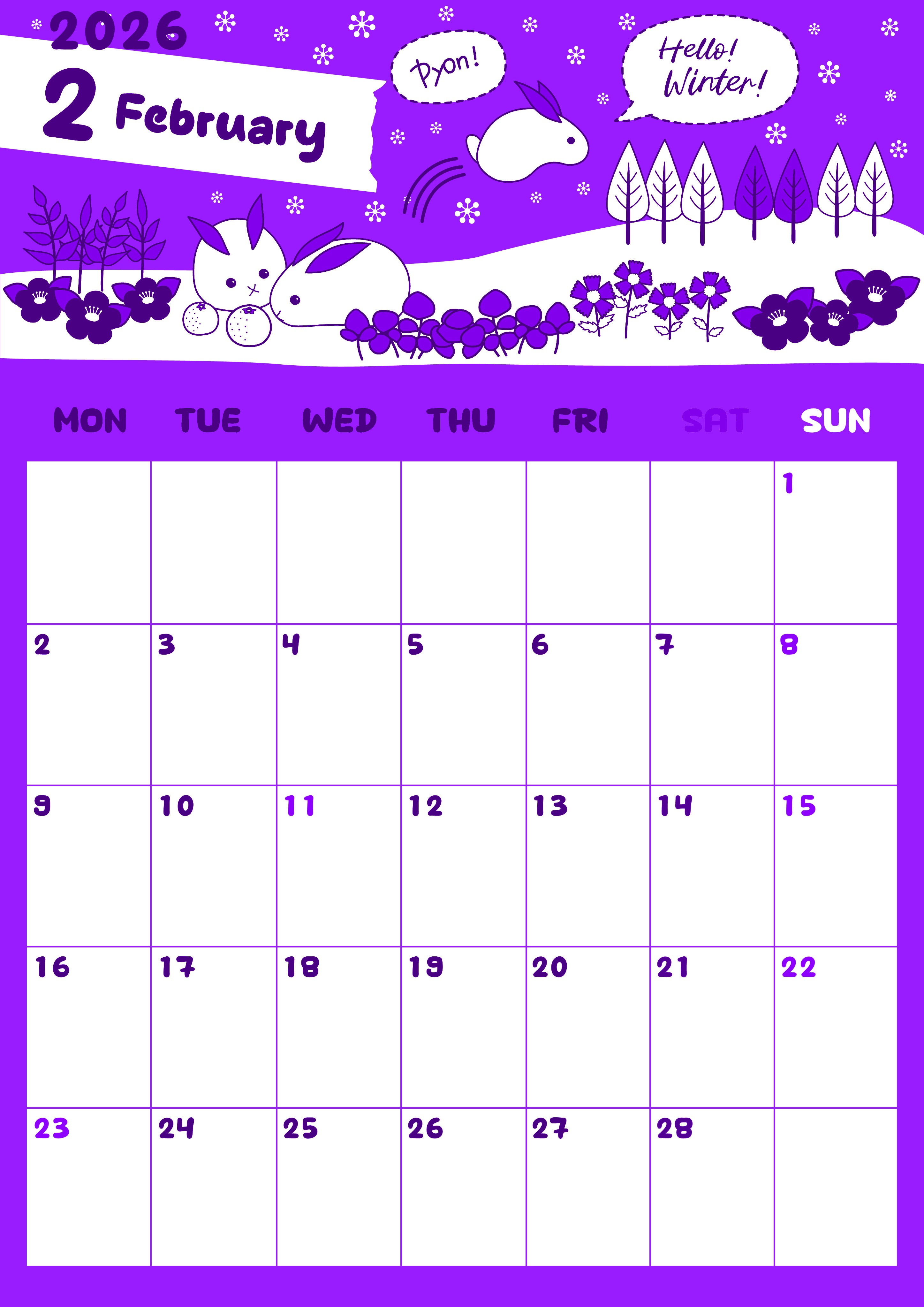 2026年2月縦型月曜始まりの無料テンプレートパープルのカレンダーです。月曜始まりのポップでかわいいイラストがとても充実している無料ダウンロードが行えるパープルのカレンダーです。曜日によって色分けされた文字も見やすいポイントに貢献しています。(2026-01000211)