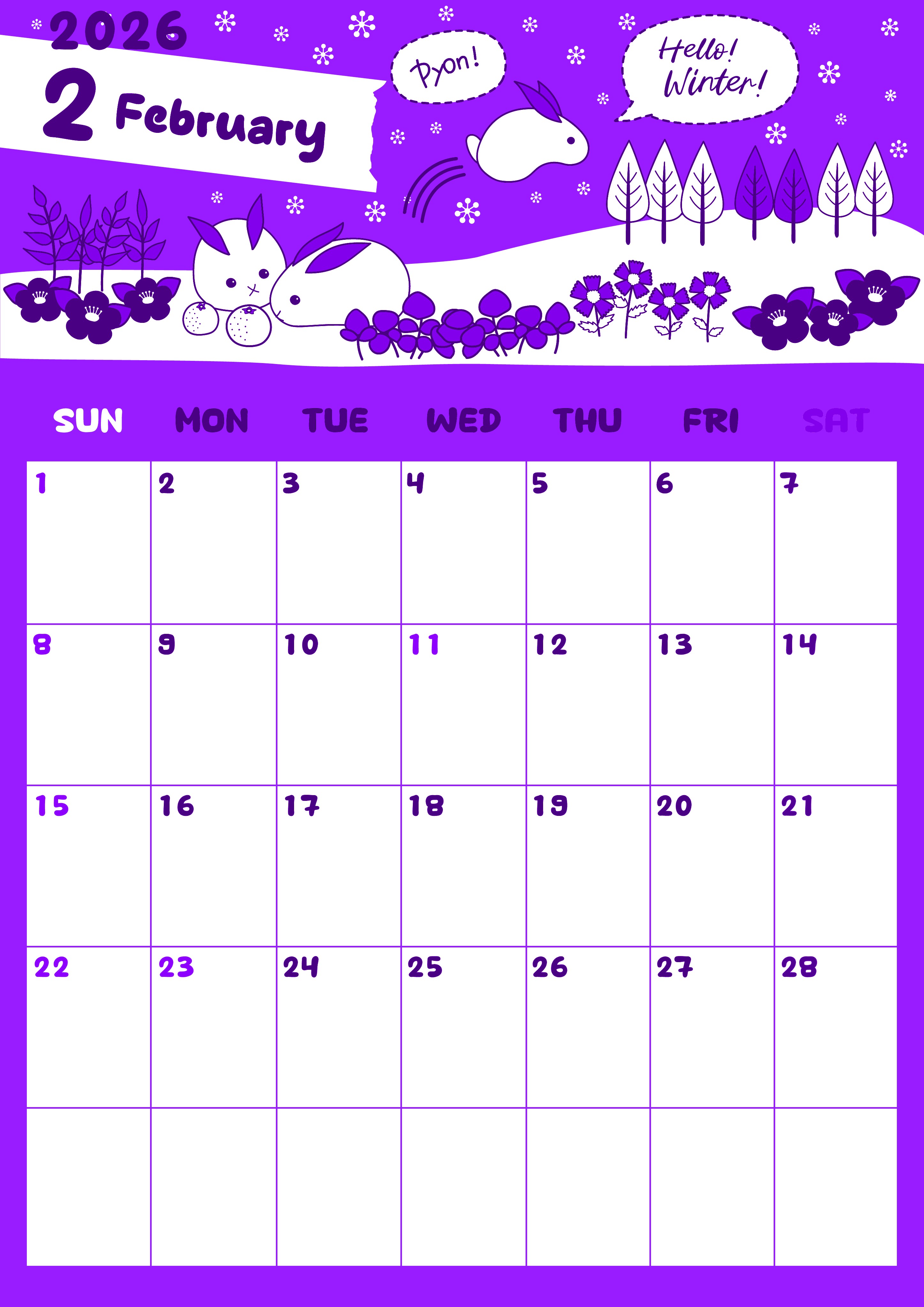 2026年2月縦型日曜始まりの無料テンプレートパープルのカレンダーです。独特の世界観が使う人の飽きを感じさせないような賑やかでポップでかわいいイラストパープルのカレンダーです。ポジティブにさせてくれます。(2026-01000210)