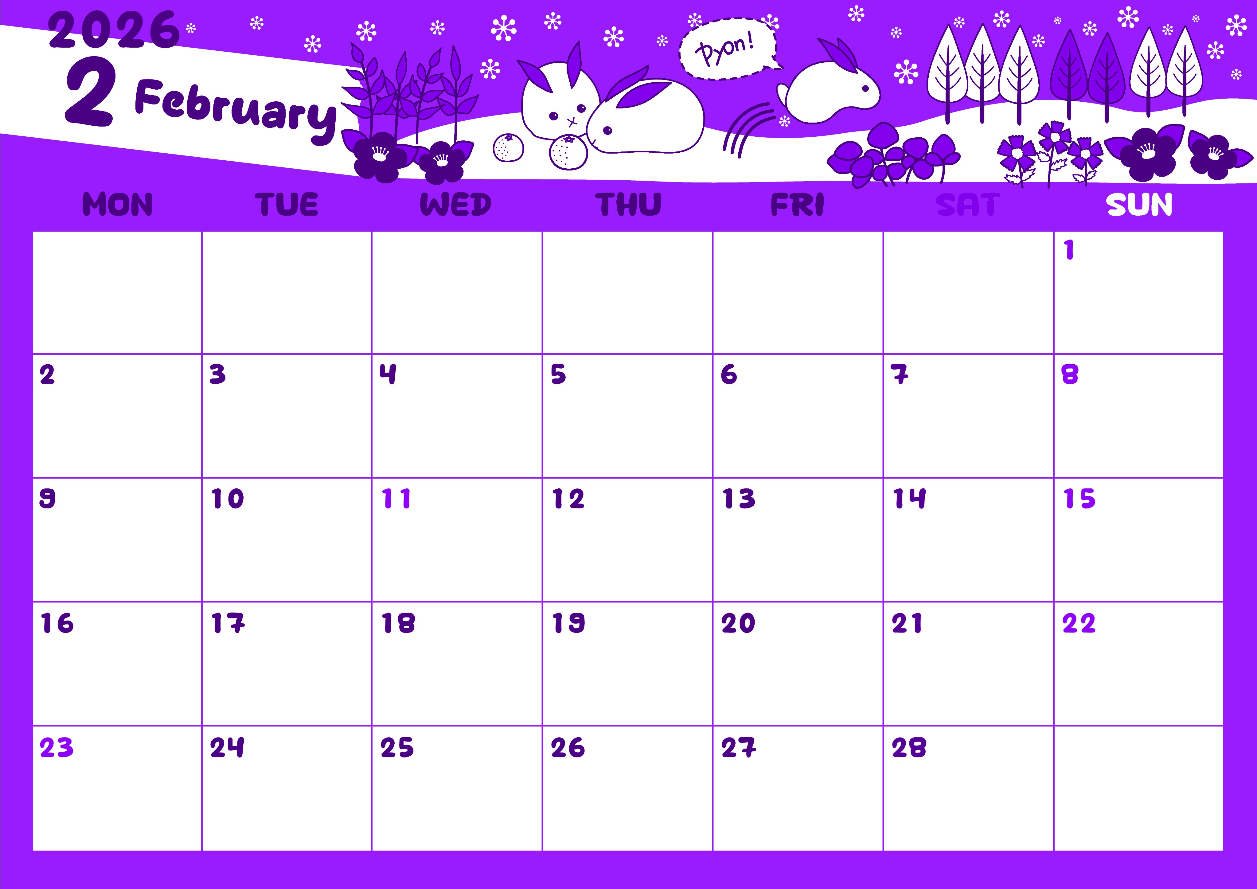 2026年2月横型月曜始まり ポップかわいいイラストA4無料パープルのカレンダー(2026-01000201)