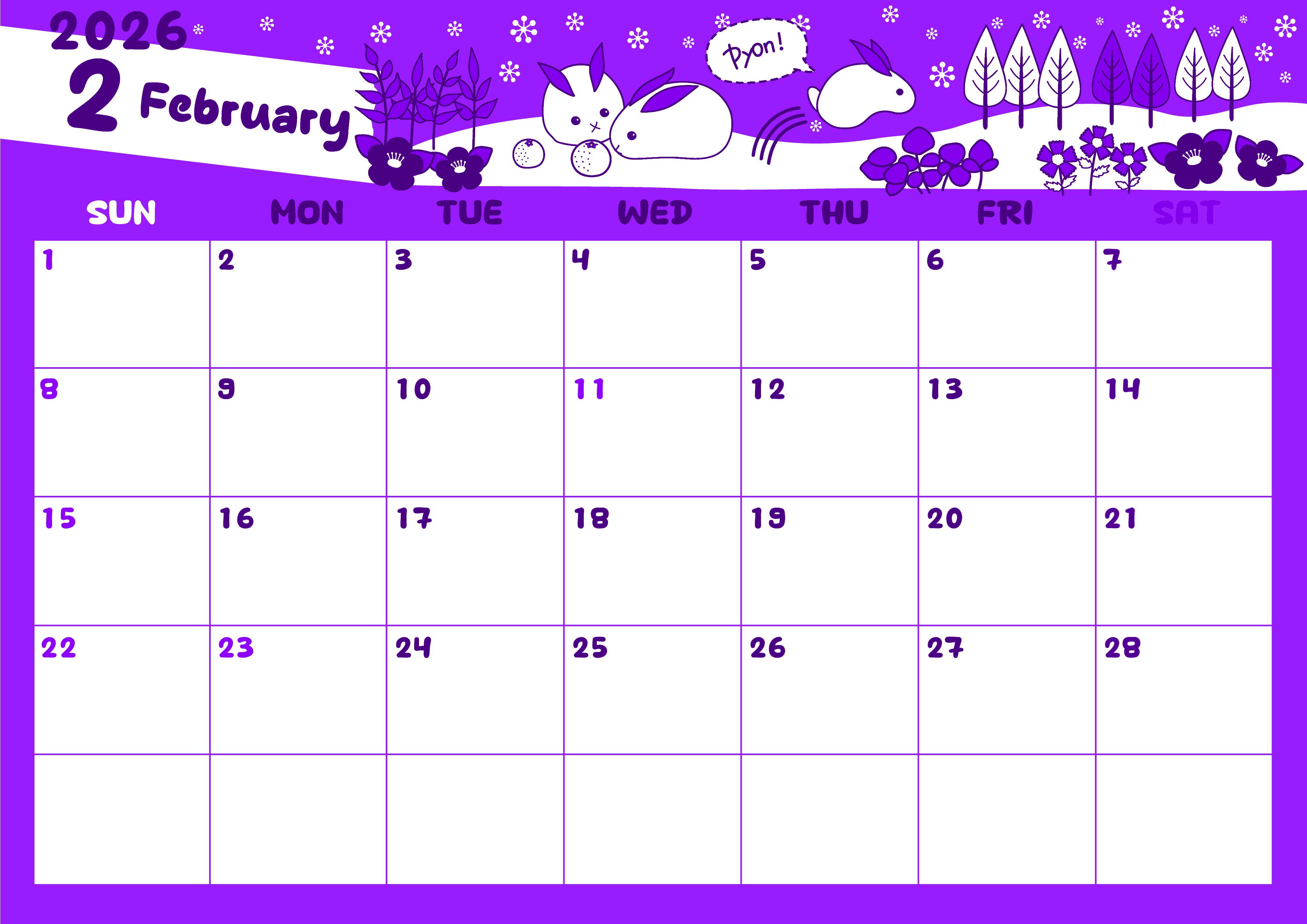 2026年2月横型日曜始まりの無料テンプレートパープルのカレンダーです。ポップで遊び心が詰まったかわいい元気を貰えるようなパープルのカレンダーです。ウサギや森のイラストを眺めているだけでも面白いフリー素材です。(2026-01000200)