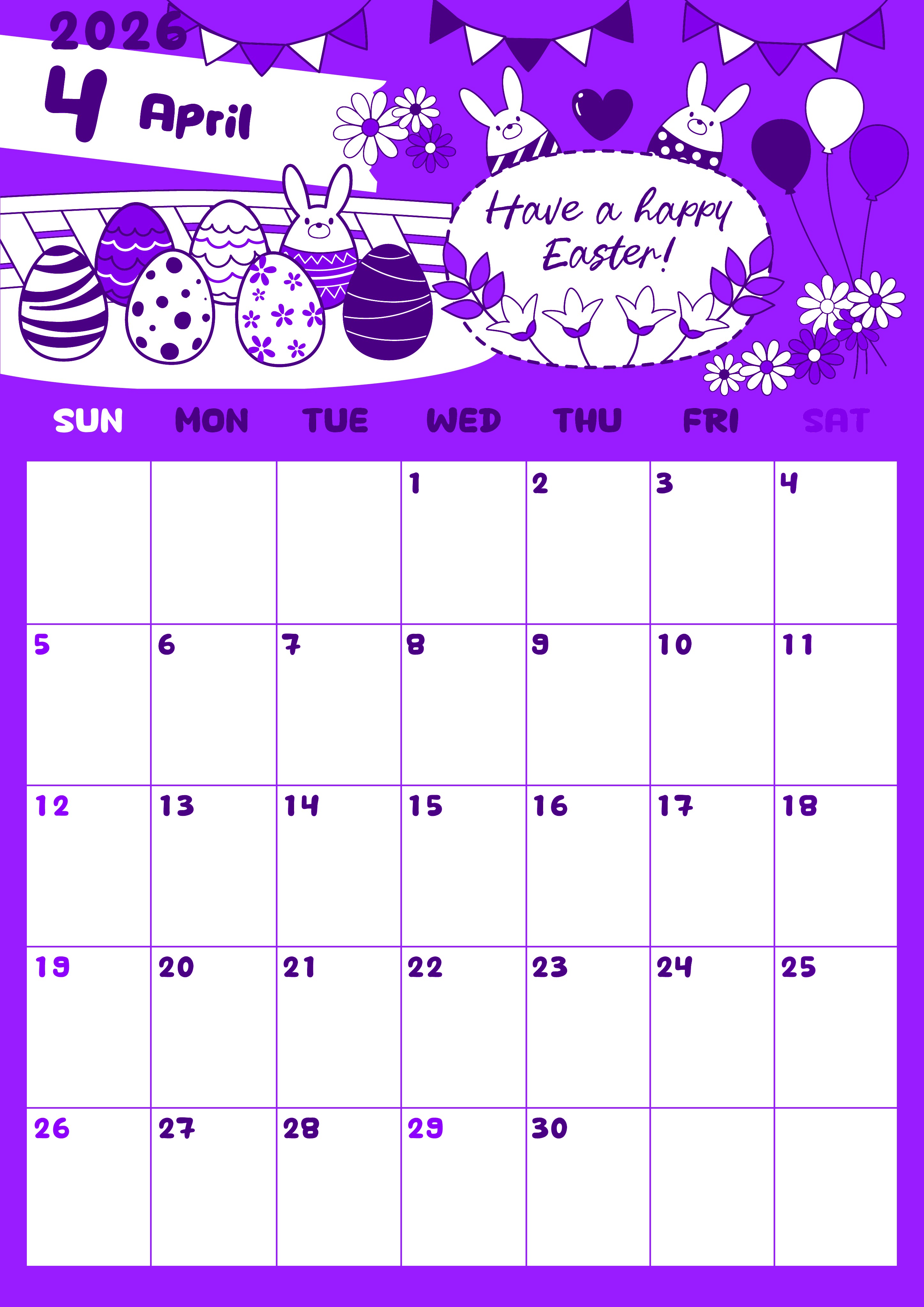 2026年4月縦型日曜始まりの無料テンプレートパープルのカレンダーです。ポップなうさぎとイースターエッグの組み合わせがかわいいパープルのカレンダーです。イラストだけでなく予定を書き込む部分も見やすいようなフォーマットとなっています。(2026-01000410)
