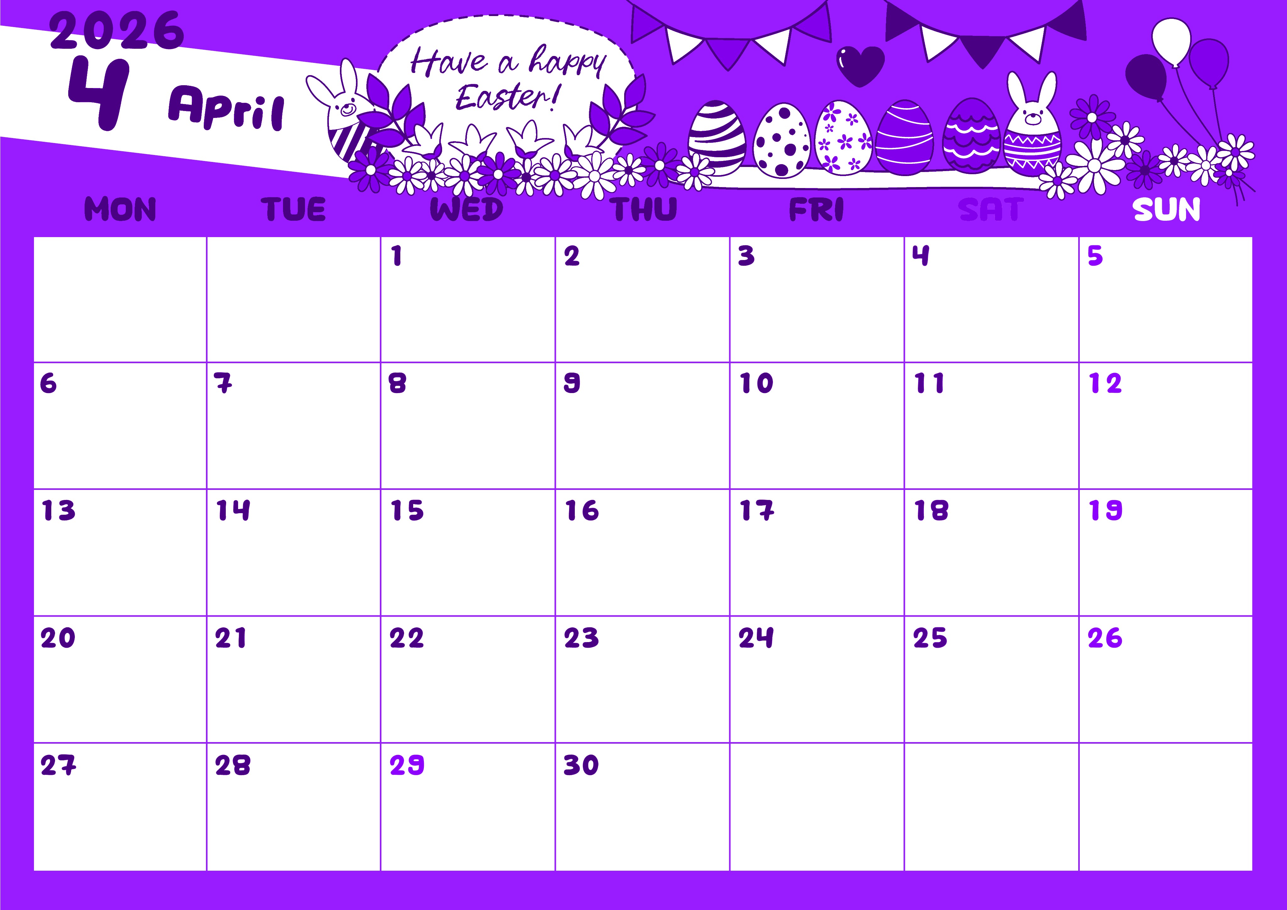 2026年4月横型月曜始まりの無料テンプレートパープルのカレンダーです。じっくりと見ていたいと思うような細部まで行き届いているかわいいイースターエッグのイラストをあしらった明るいパープルのカレンダー素材です。(2026-01000401)