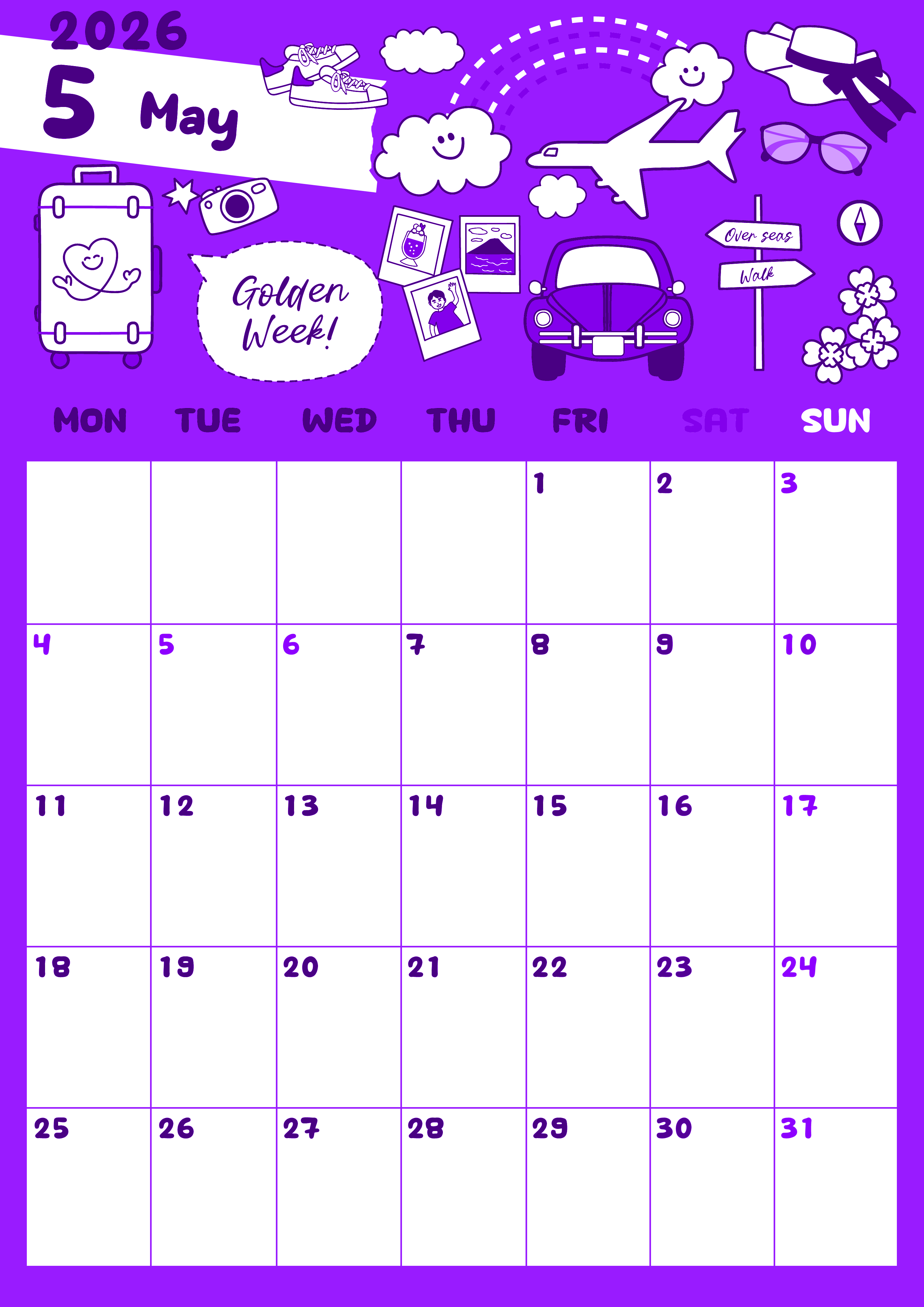 2026年・無料のカレンダーテンプレート 2026年5月縦型月曜始まり GWイラストのかわいいA4無料パープルのカレンダー(2026-01000511) 素材状デザイン王 2025年4月6日 2026年5月縦型月曜始まりの無料テンプレートパープルのカレンダーです。GWをテーマにしているかわいいイラストテンプレートです。書き込みが沢山できるので行事の把握もやりやすいです。(2026-01000511) 5月 縦型のカレンダー 月曜始まり パープル カレンダーデザイン-0100
