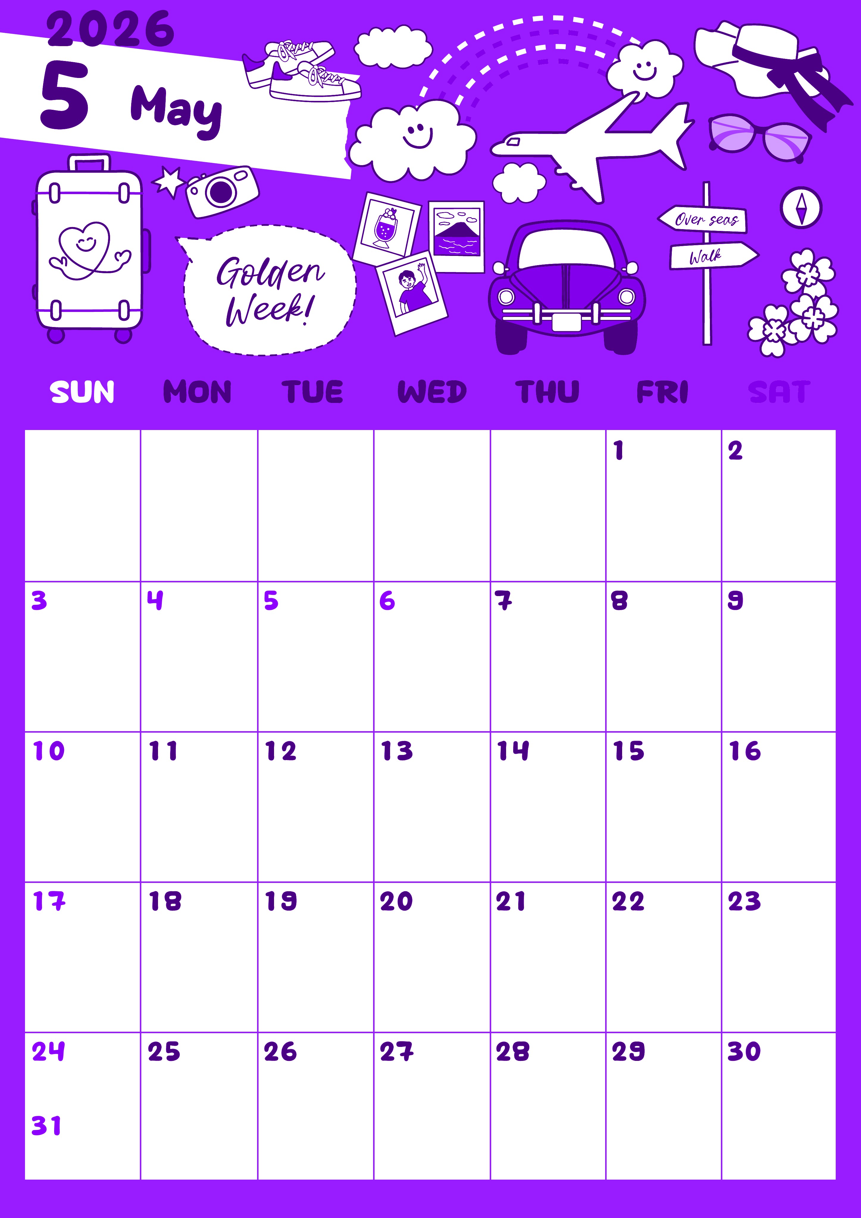 2026年5月縦型日曜始まりの無料テンプレートパープルのカレンダーです。飛行機や車やスーツケースのイラストがGWのバケーションを連想させてくれるかわいいパープルのカレンダーでダウンロードは無料で簡単です。(2026-01000510)