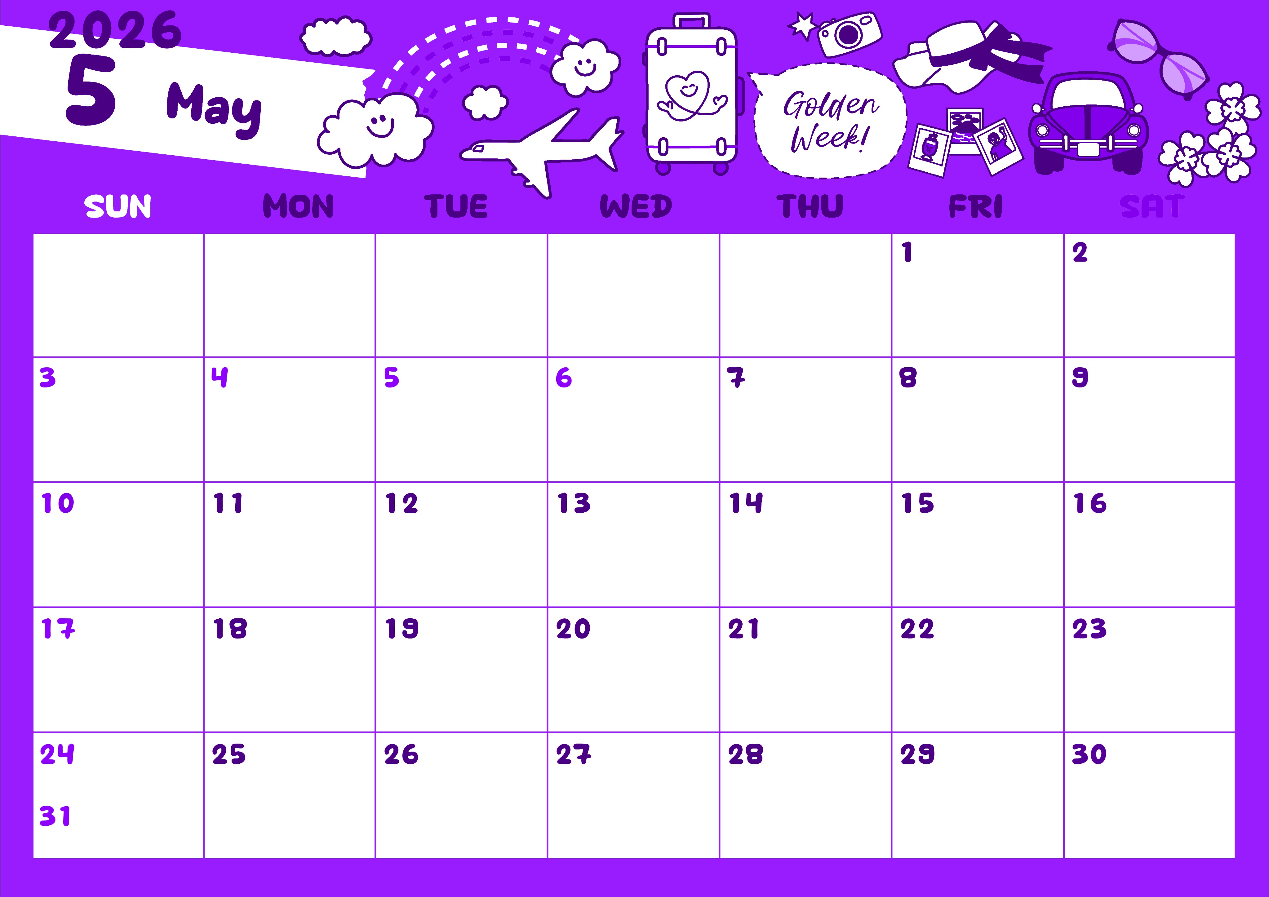 2026年5月横型日曜始まりの無料テンプレートパープルのカレンダーです。GWといえば飛行機や車に乗って国内旅行や海外旅行を楽しむ人も少なくありません。旅行の楽しさが伝わってくるポップでかわいいイラストのパープルのカレンダーです。(2026-01000500)
