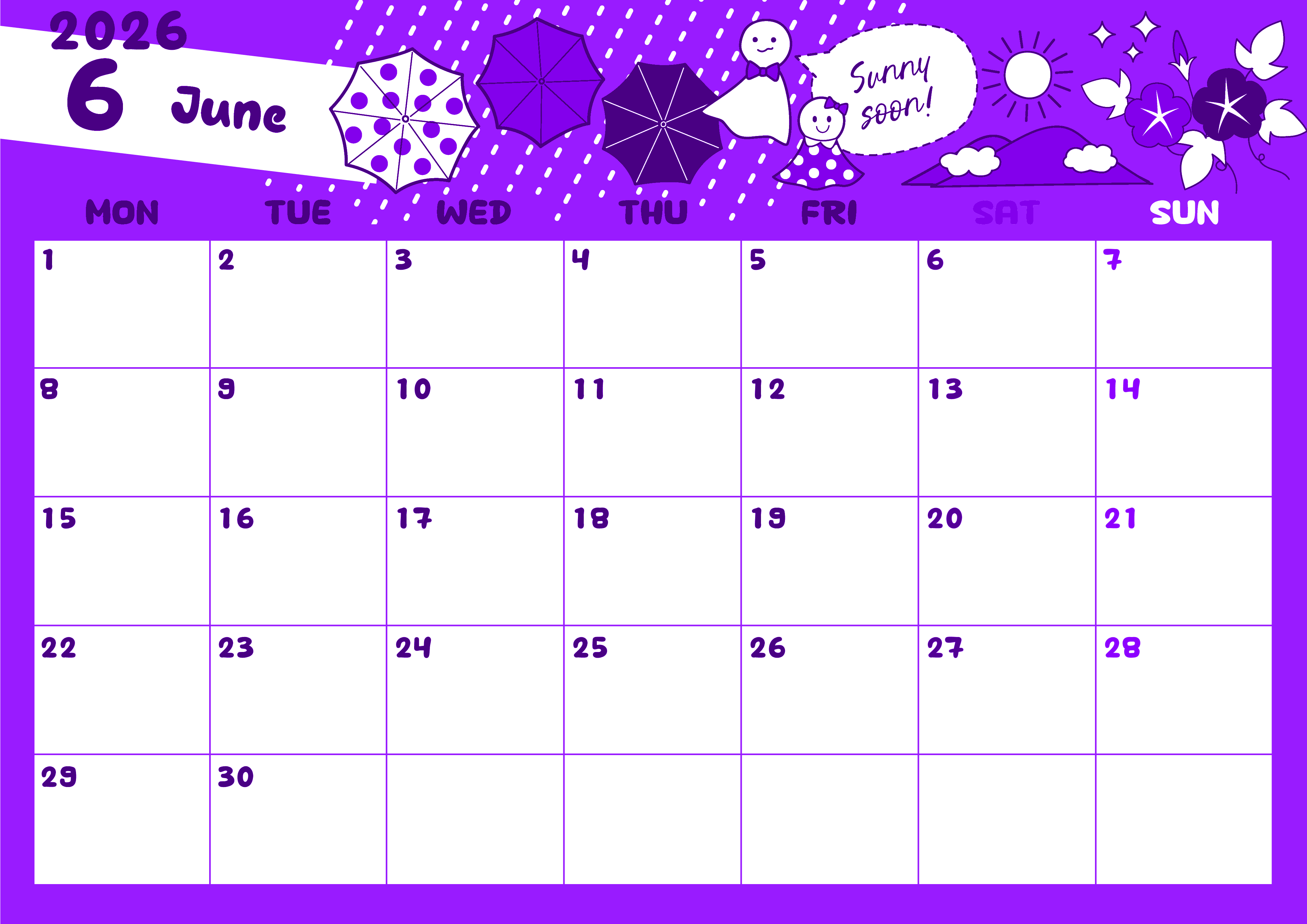 2026年6月横型月曜始まりの無料テンプレートパープルのカレンダーです。月曜始まりパープルのカレンダーが好きな人に適しています。季節の風物詩となるてるてる坊主や傘や朝顔というバラエティ豊かなポップでかわいいイラストが敷き詰められています。(2026-01000601)