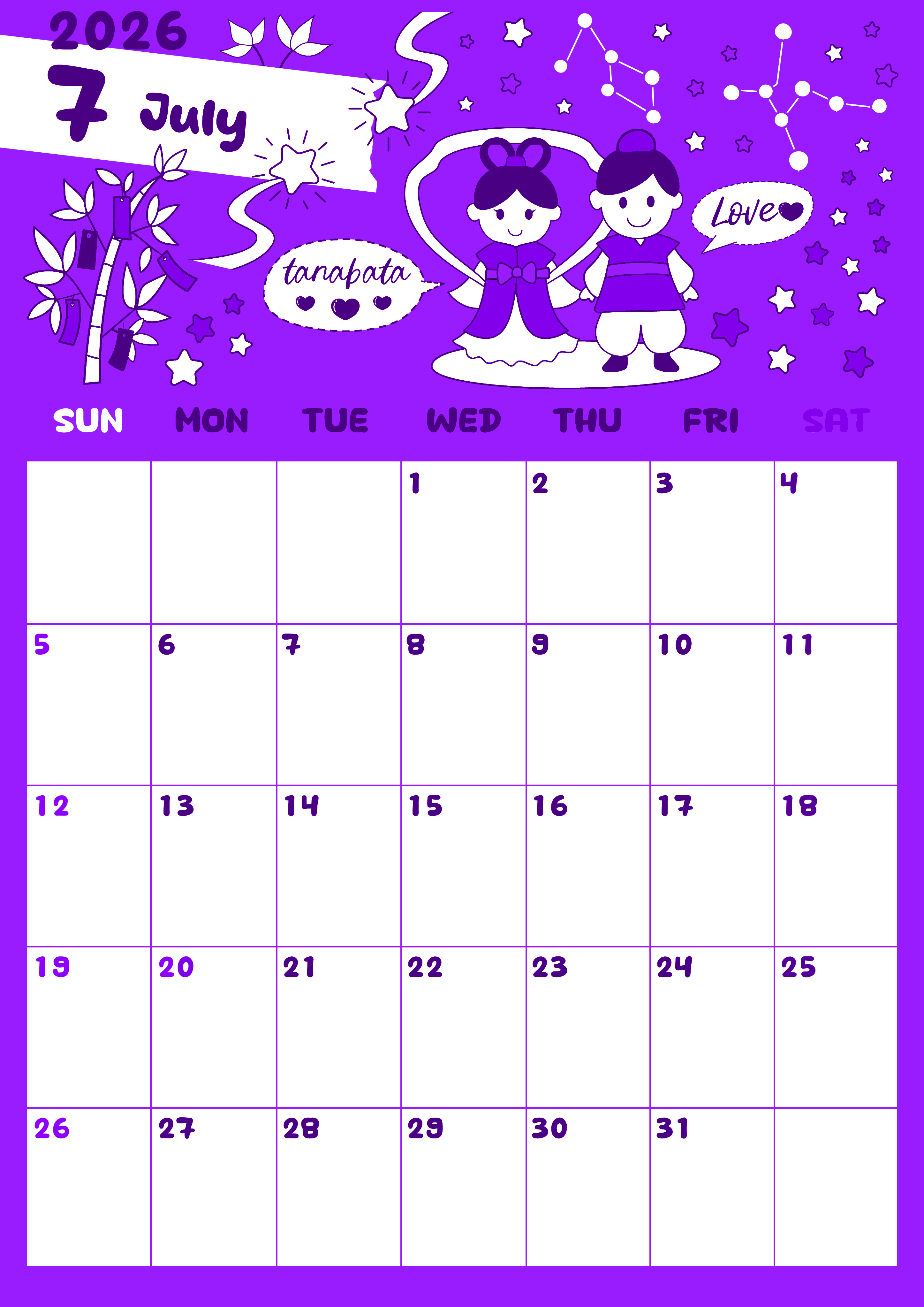 2026年7月縦型日曜始まりの無料テンプレートパープルのカレンダーです。ポップテイストが好みな人にとてもおすすめできるかわいいイラスト付きの縦向きパープルのカレンダーです。ペンで予定を書き込みやすいようになっています。(2026-01000710)