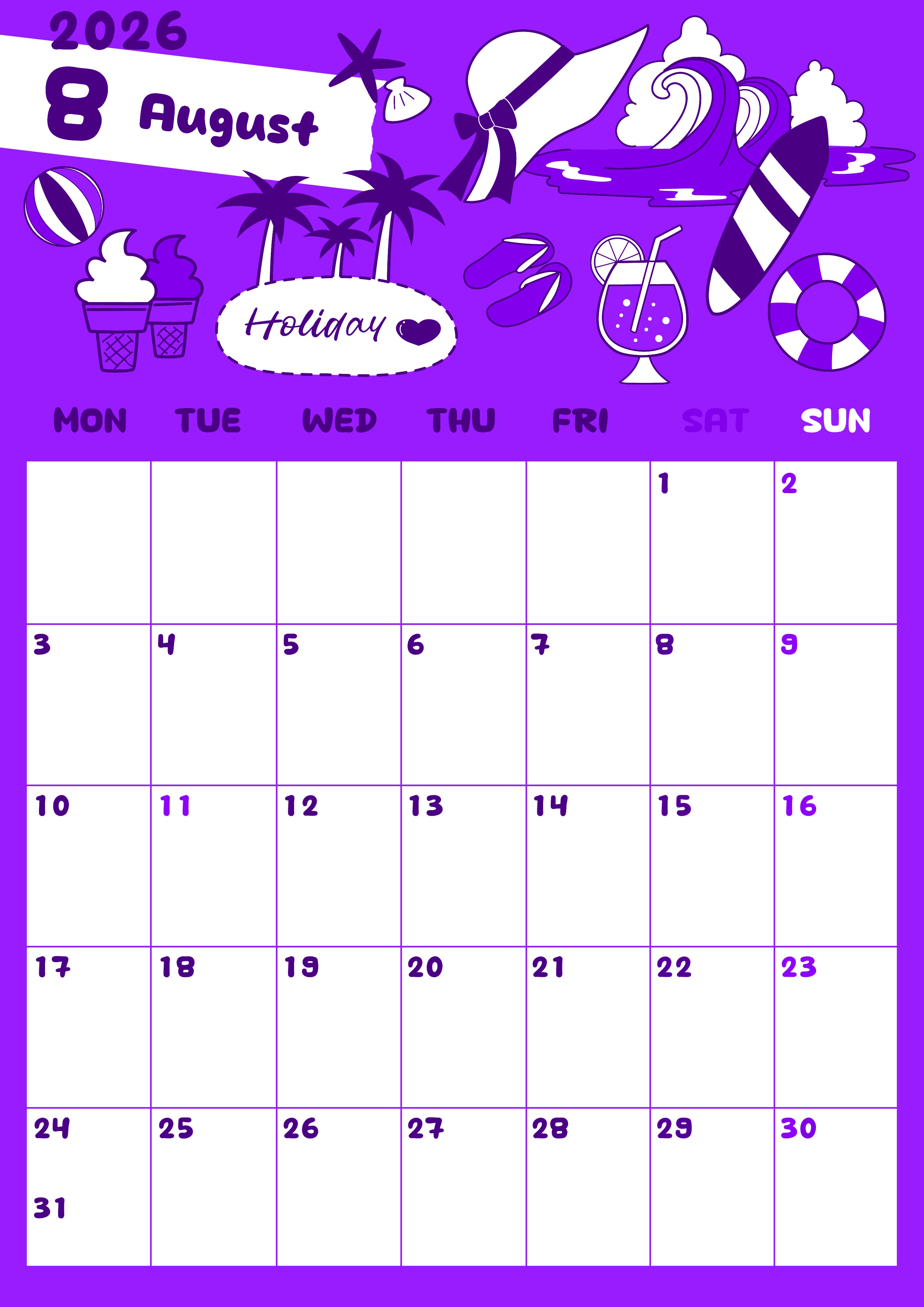 2026年8月縦型月曜始まりの無料テンプレートパープルのカレンダーです。月曜始まりで罫線も引いてある使い勝手の良いパープルのカレンダーには海岸の賑やかな雰囲気が伝わってくるようなかわいいポップなイラストが目白押しです。(2026-01000811)