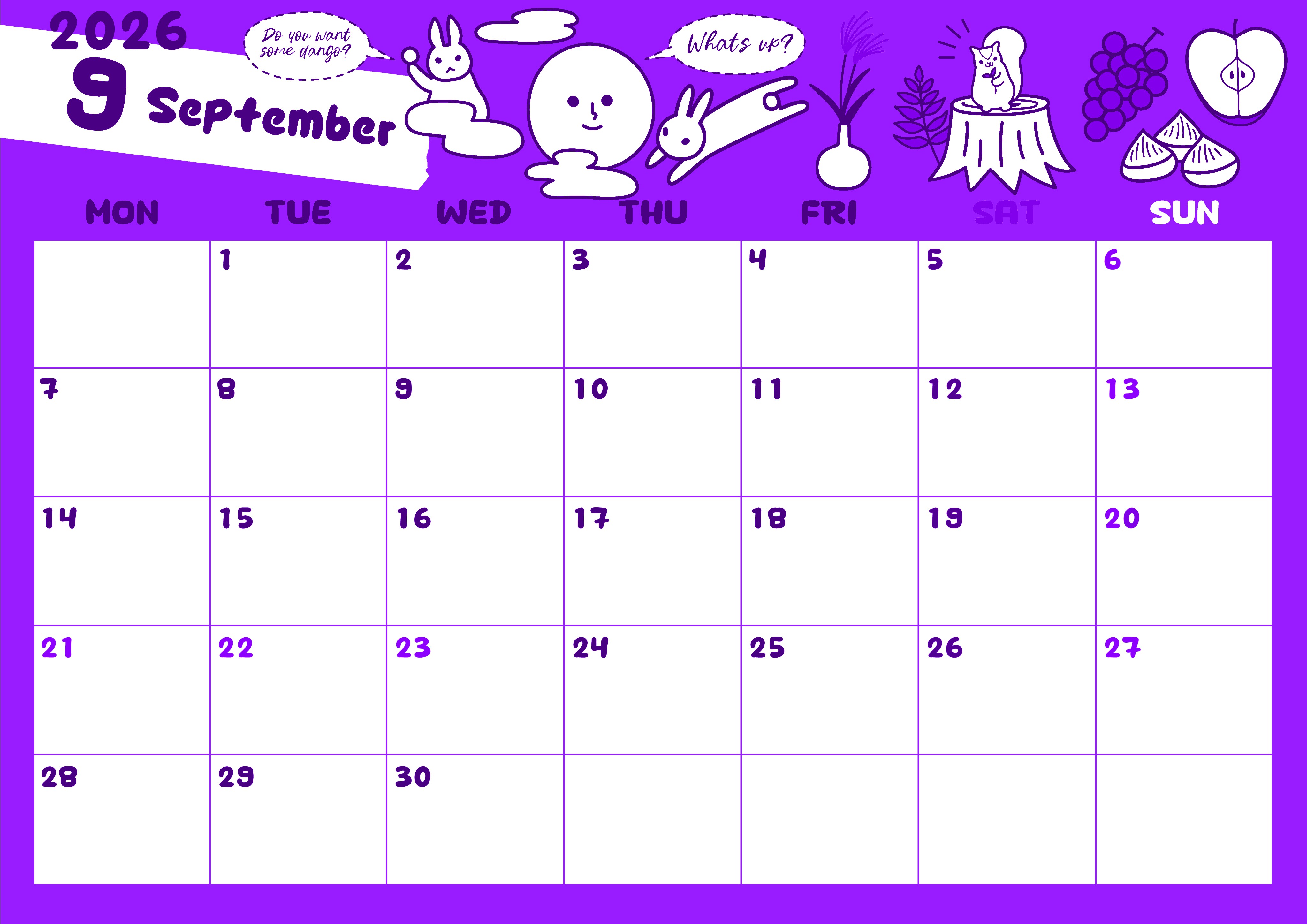 2026年9月横型月曜始まりの無料テンプレートパープルのカレンダーです。枠が特徴的でポップです。森の動物をポップなタッチで一匹ずつ丁寧に描いたかわいい細部まで技巧が行き届いたイラストパープルのカレンダーとなっています。(2026-01000901)