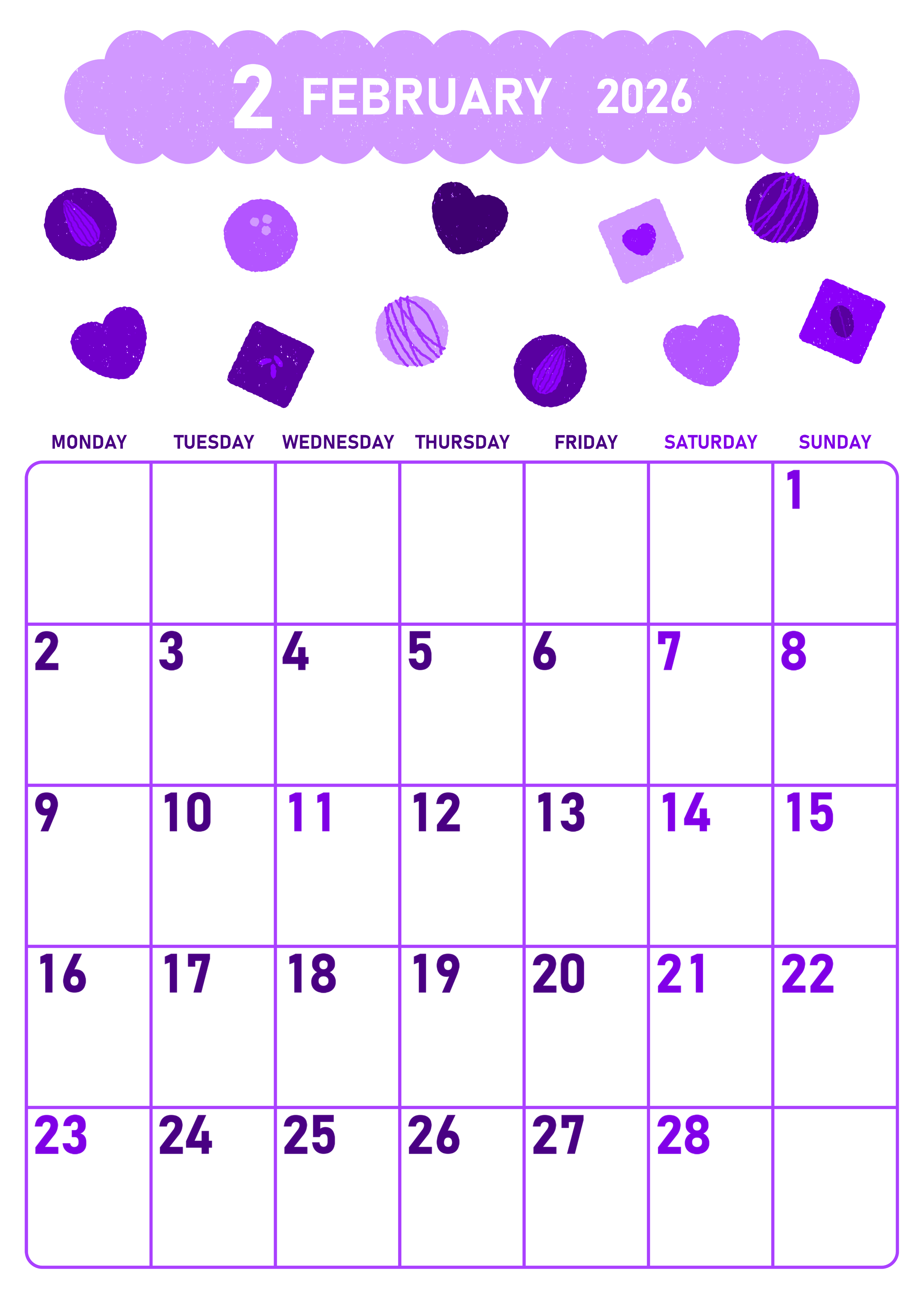 2026年2月縦型月曜始まりパープルのカレンダーです。チョコレートがかわいいイラスト付きのフォーマットです。月曜始まりのパープルのカレンダーで書き込みできるエリアは広くとってあるので使いやすいです。(2026-01010211)