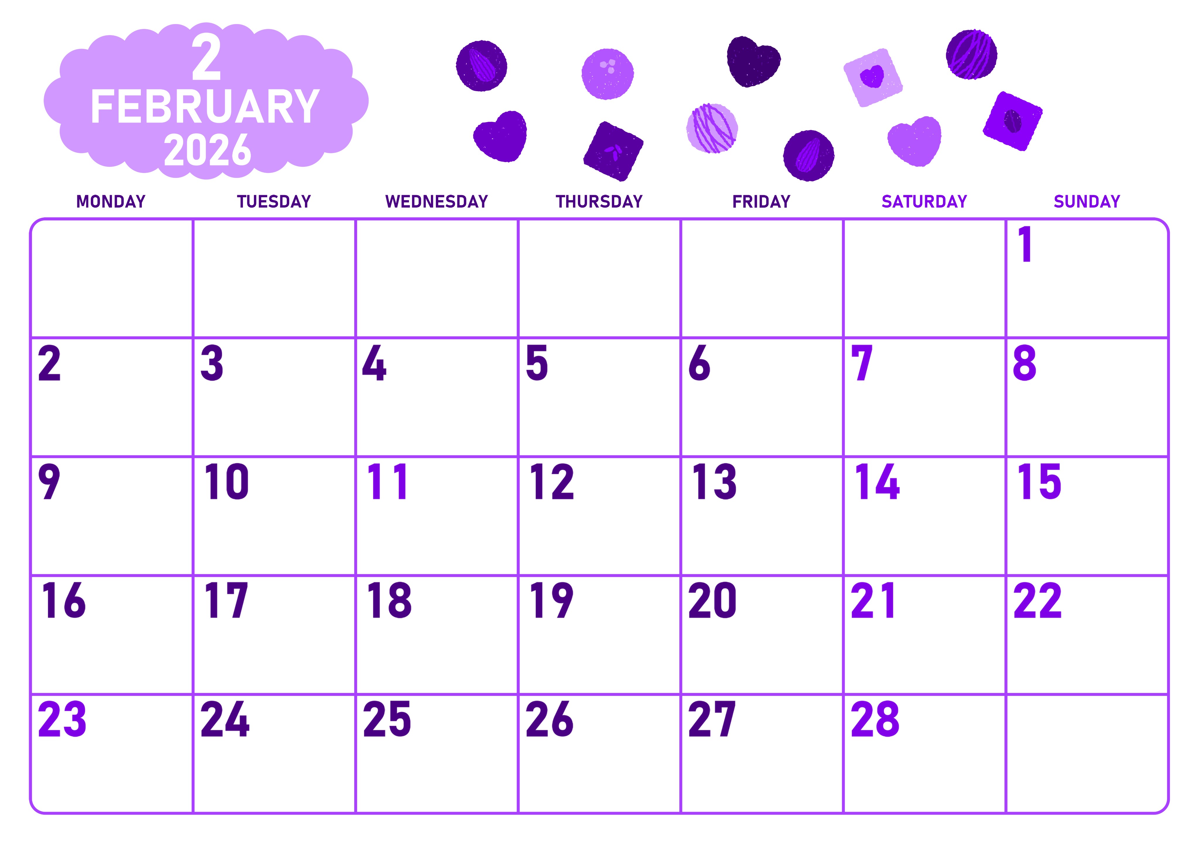 2026年・無料のカレンダーテンプレート 2026年2月横型月曜始まり チョコのイラストがかわいいA4無料パープルのカレンダー(2026-01010201) 素材状デザイン王 2025年4月6日 2026年2月横型月曜始まりパープルのカレンダーです。ハートや丸や四角と形のバラエティに富んだチョコレートたちがかわいいイラスト付きの月曜始まりで便利なフォーマットのパープルのカレンダーです。(2026-01010201) 2月 横型のカレンダー 月曜始まり パープル カレンダーデザイン-0101