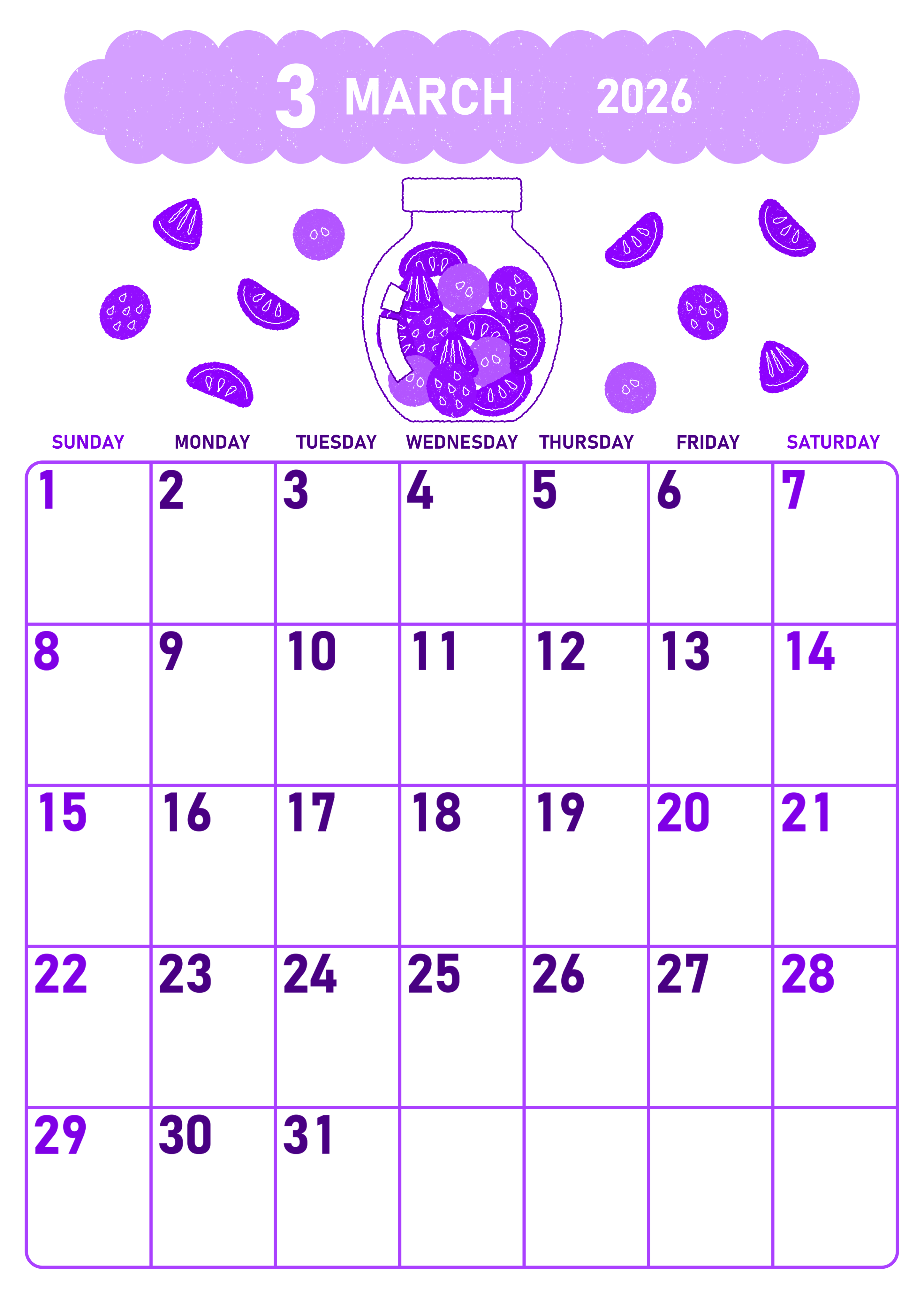 2026年3月縦型日曜始まりの無料テンプレートパープルのカレンダーです。果物の味があるバラエティ豊かなガラス瓶に詰め込まれたキャンディがカラフルでかわいいイラストのついている無料パープルのカレンダーです。(2026-01010310)
