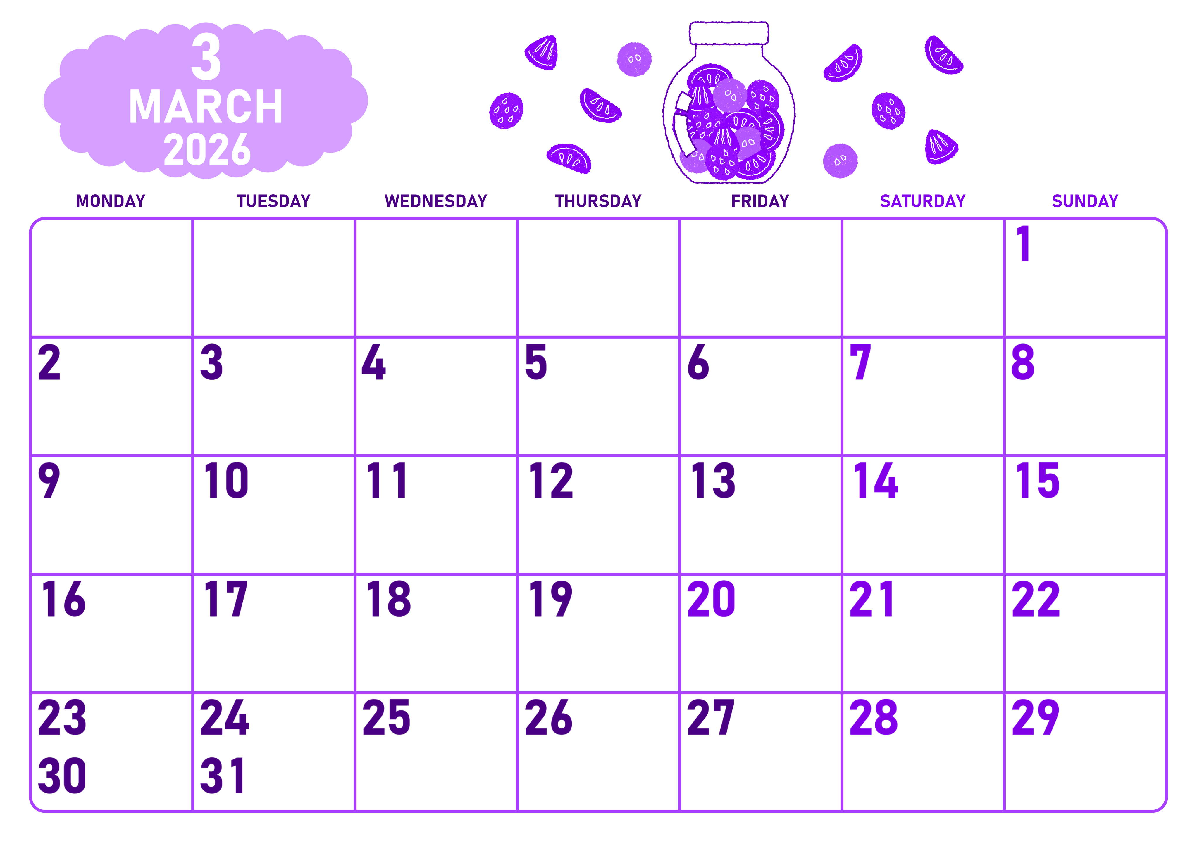 2026年3月横型月曜始まり 果物イラストのかわいいA4無料パープルのカレンダー(2026-01010301)