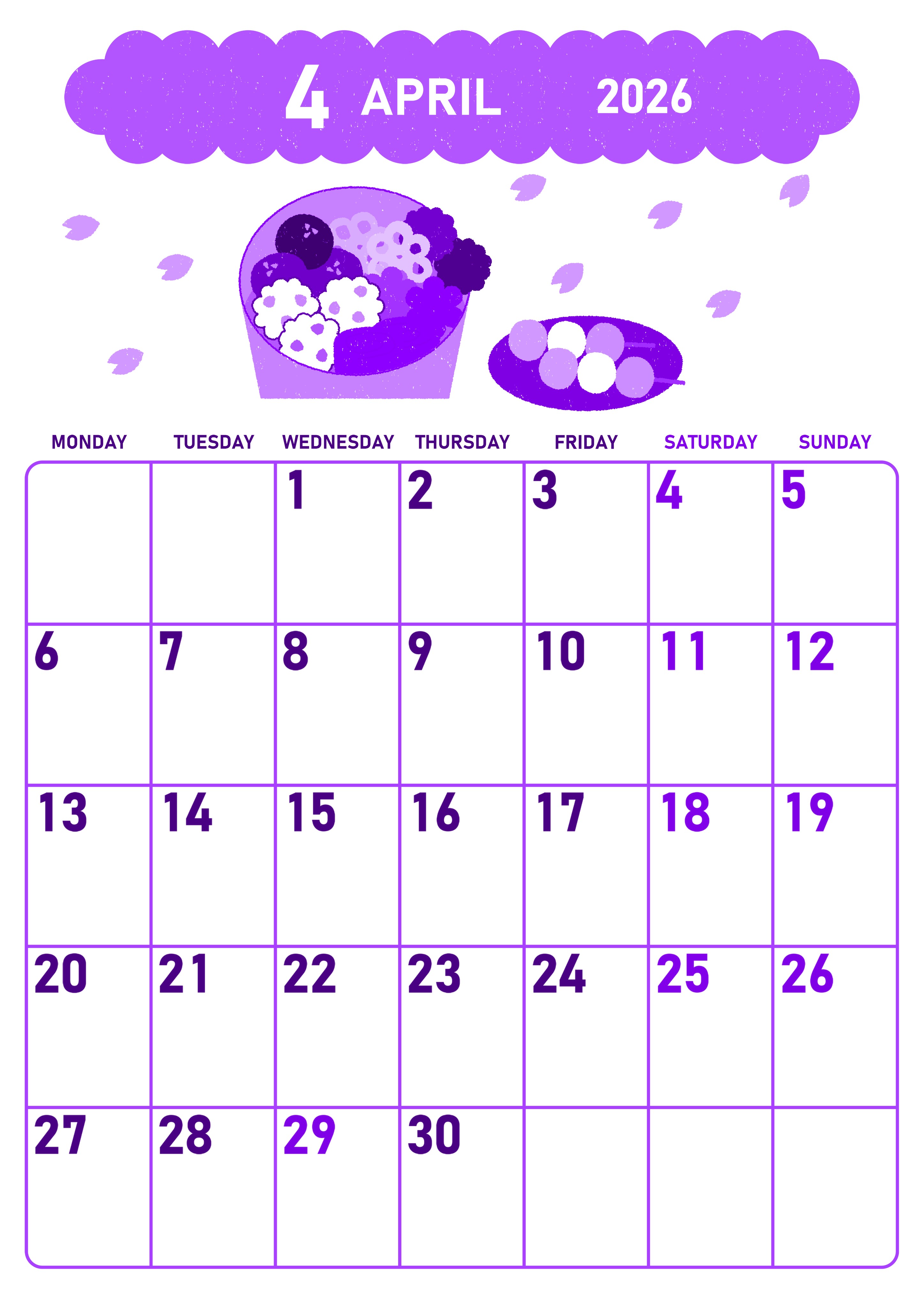 2026年4月縦型月曜始まりの無料テンプレートパープルのカレンダーです。お花見で食べる三色団子はおいしいですよね。春らしいかわいいイラストがアクセントになっているシンプルなパープルのカレンダーの無料素材です。(2026-01010411)
