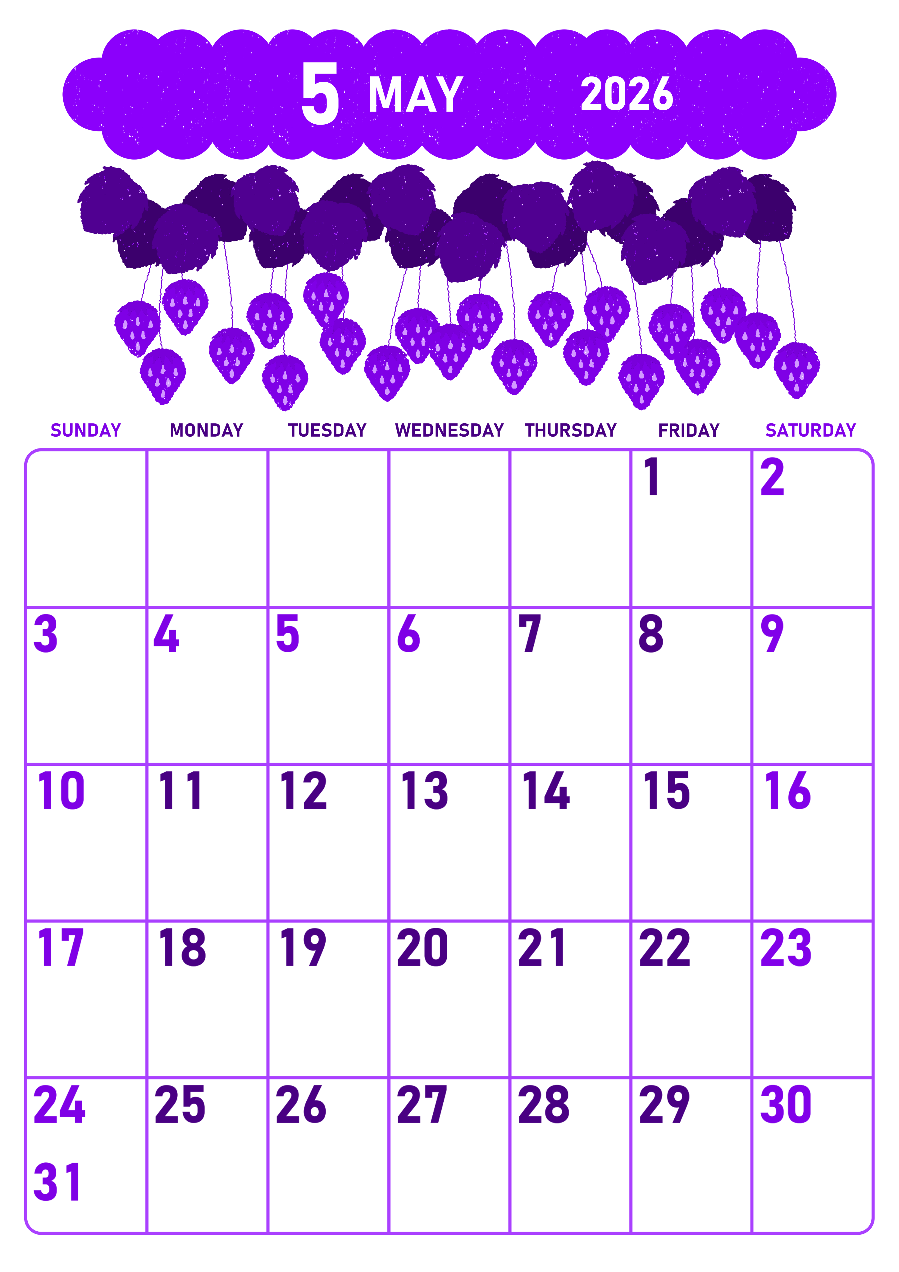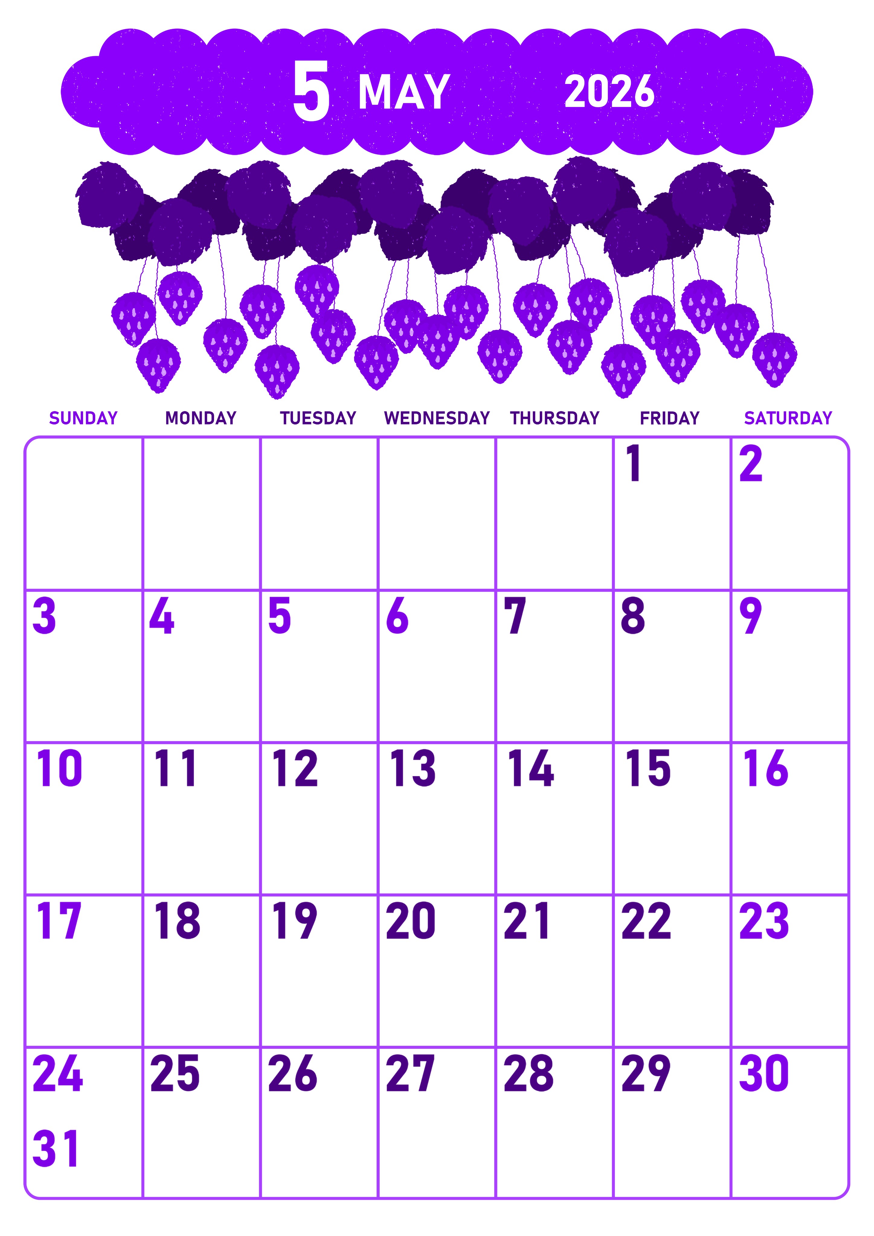 2026年5月縦型日曜始まりの無料テンプレートパープルのカレンダーです。かわいいいちごが食欲をそそるようなイラスト付きパープルのカレンダーです。A4サイズの汎用的なパープルのカレンダーなので無料でダウンロードを行えばすぐにご利用可能です。(2026-01010510)