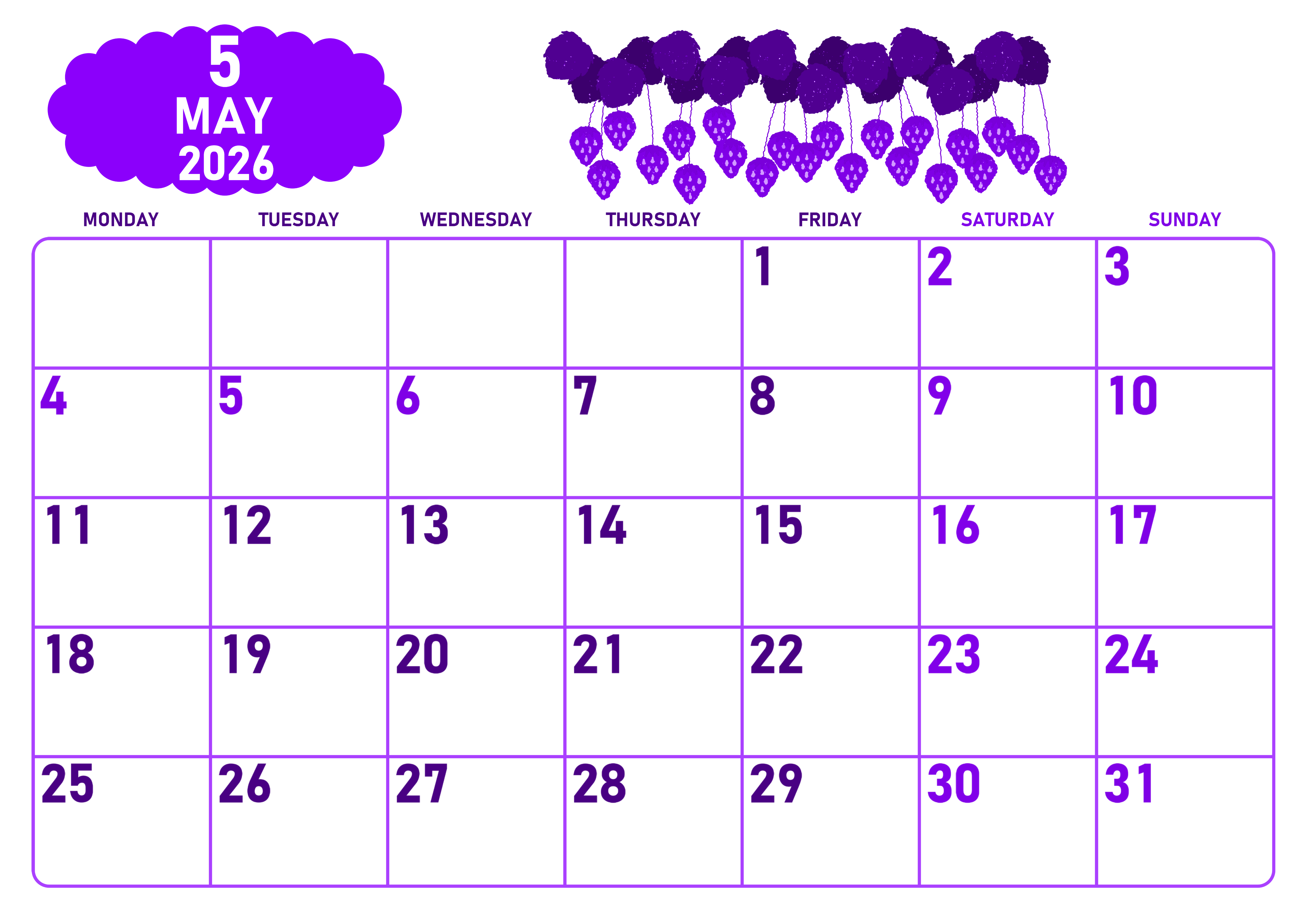 2026年5月横型月曜始まりの無料テンプレートパープルのカレンダーです。いちごがチャームポイントなかわいいイラストパープルのカレンダーです。月曜始まりで行事をいっぱい書き込みできる利便性の高いフォーマットです。(2026-01010501)