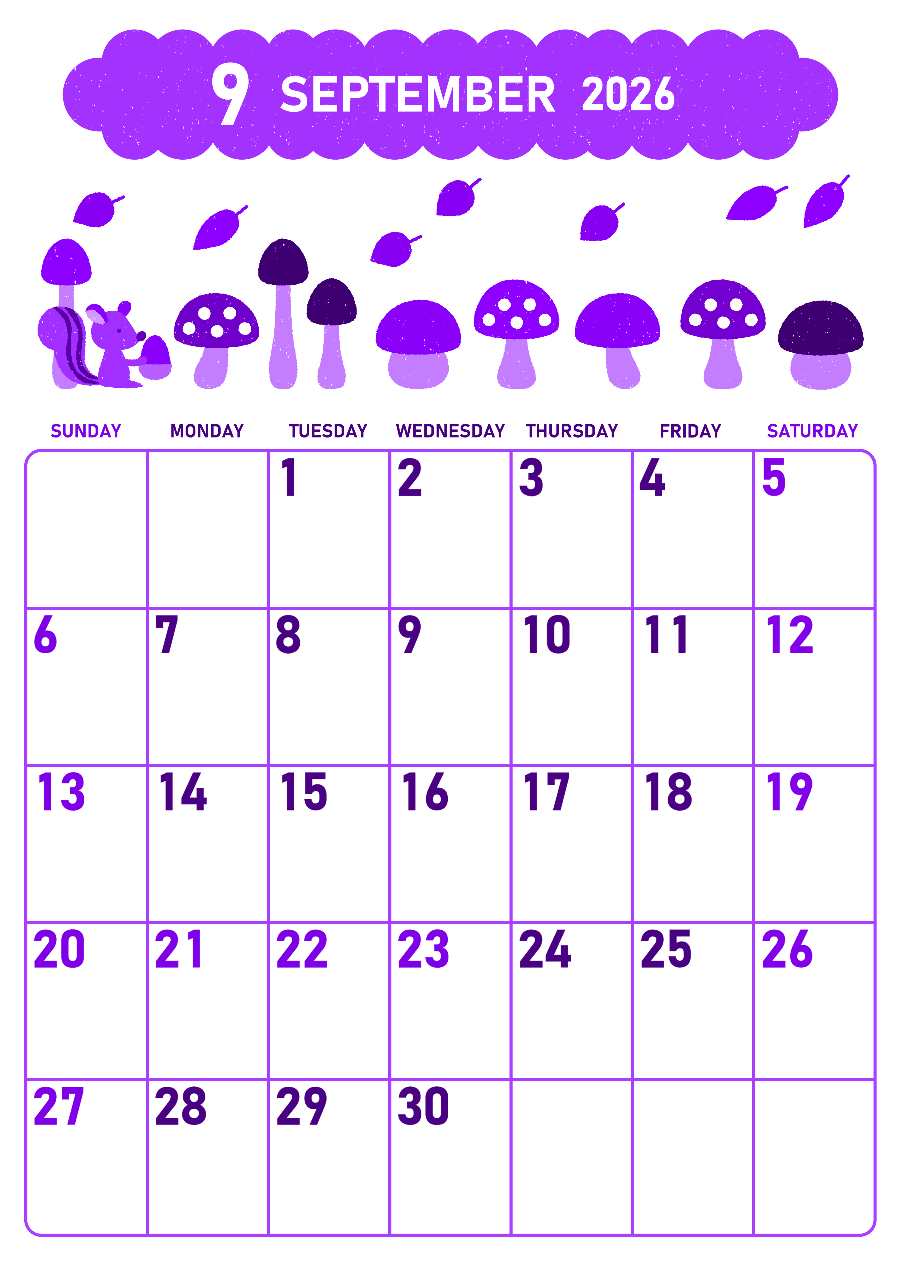 2026年9月縦型日曜始まりの無料テンプレートパープルのカレンダーです。いろいろなタイプのキノコがたくさん並んでるところに紅葉が漂っている様子が描かれているイラストは秋の季節を感じさせるかわいい雰囲気になっています。(2026-01010910)