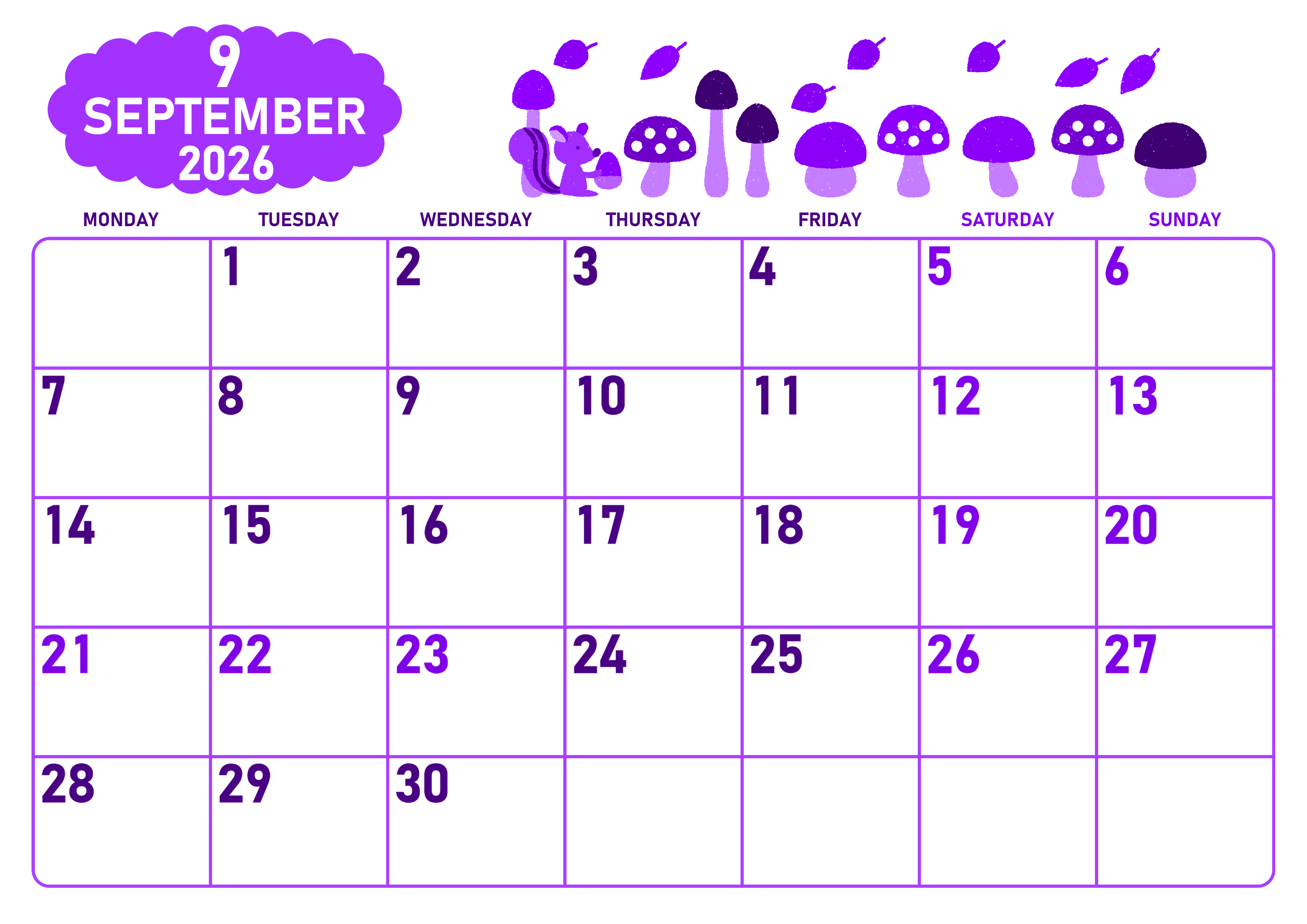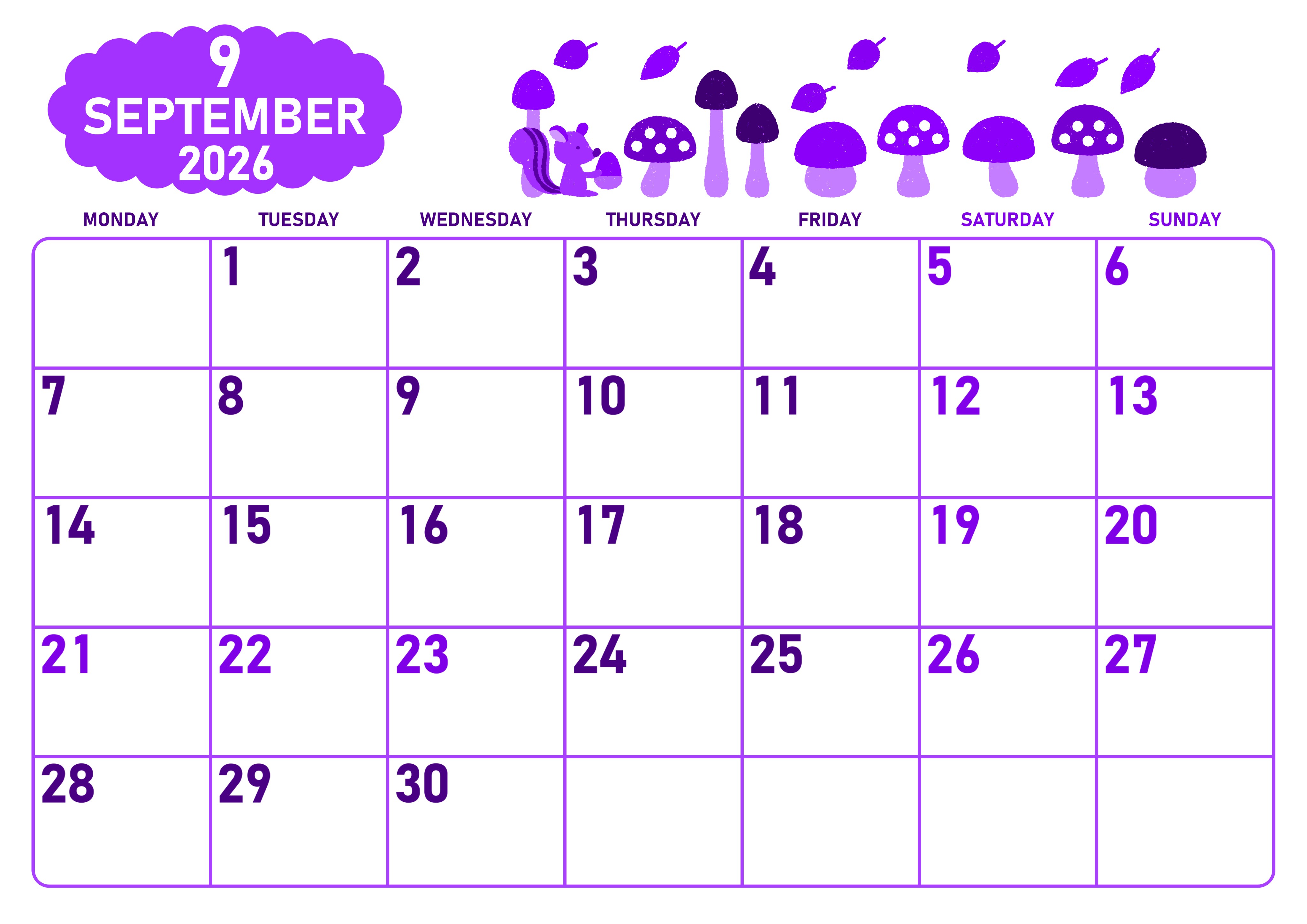 2026年9月横型月曜始まりの無料テンプレートパープルのカレンダーです。秋の季節をテーマにしているほのぼのとしたかわいいイラストに仕上がっています。(2026-01010901)