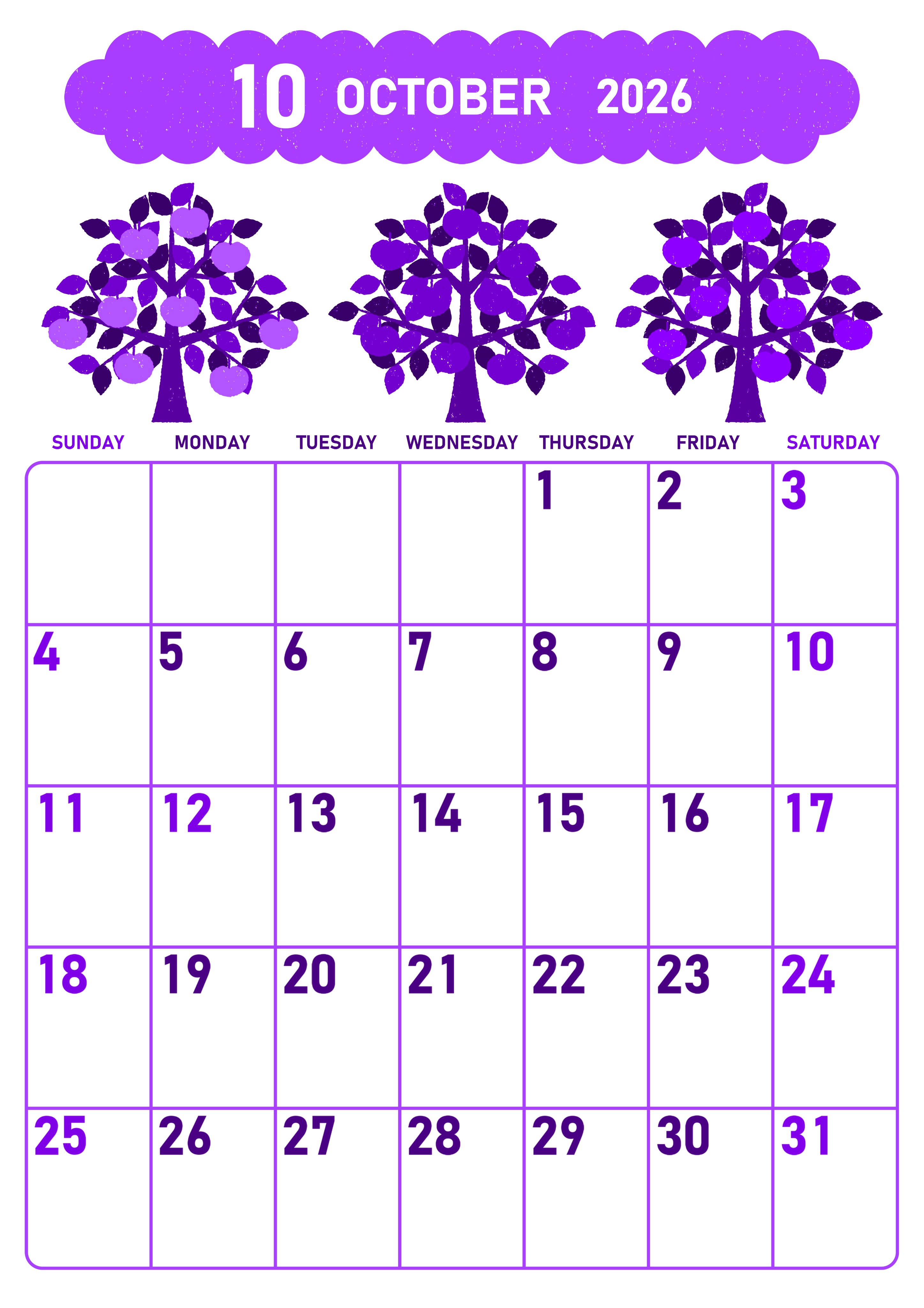 2026年・無料のカレンダーテンプレート 2026年10月縦型日曜始まり リンゴの木イラストのかわいいA4無料パープルのカレンダー(2026-01011010) 素材状デザイン王 2025年4月6日 2026年10月縦型日曜始まりの無料テンプレートパープルのカレンダーです。リンゴの木のイラストがかわいいです。罫線が引かれていて余白もたっぷりで曜日で文字色分けがされているので利便性も高いです。(2026-01011010) 10月 縦型のカレンダー 日曜始まり パープル カレンダーデザイン-0101