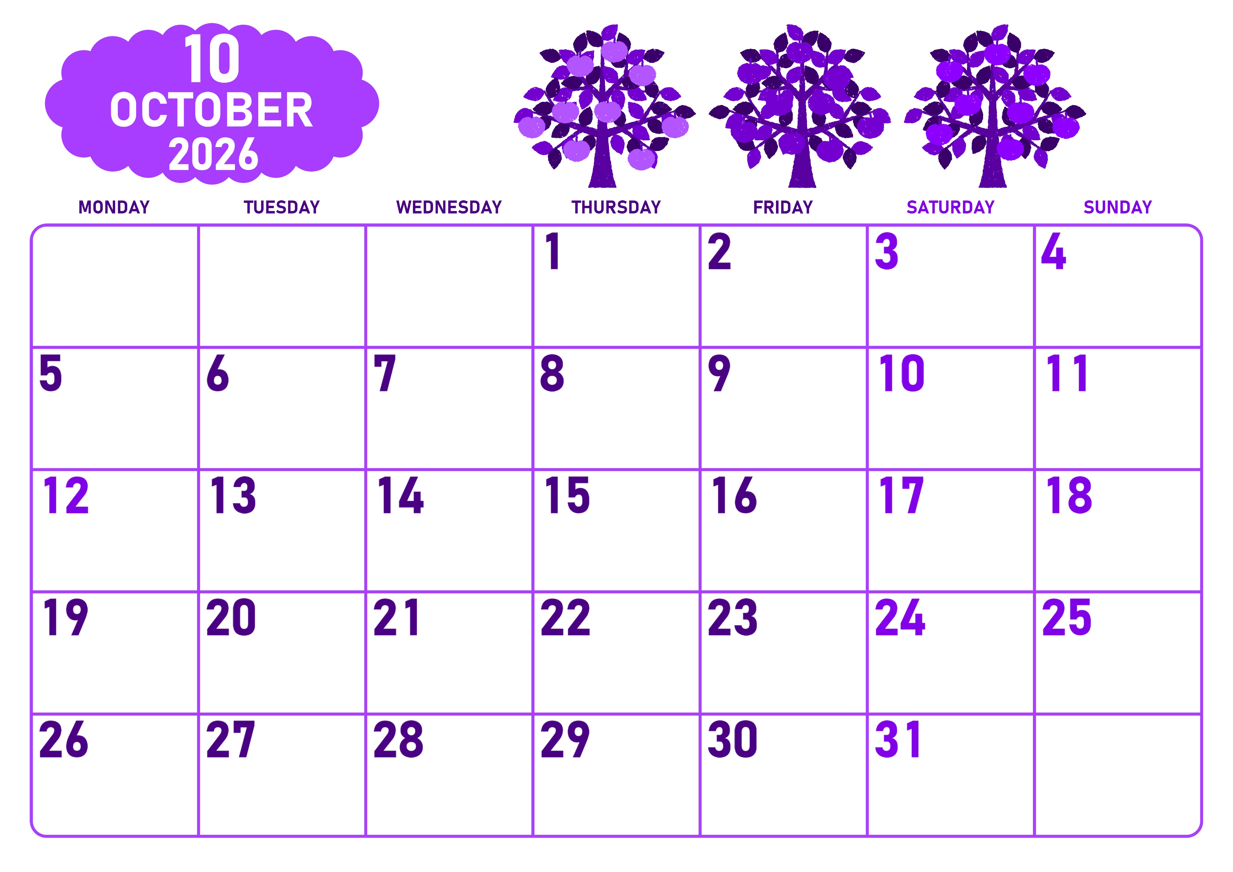 2026年10月横型月曜始まりの無料テンプレートパープルのカレンダーです。リンゴの木が3本並んでいる様子がとても平和でほのぼのしていてかわいいイラストです。月曜始まりで毎日を充実させるのに向いています。(2026-01011001)