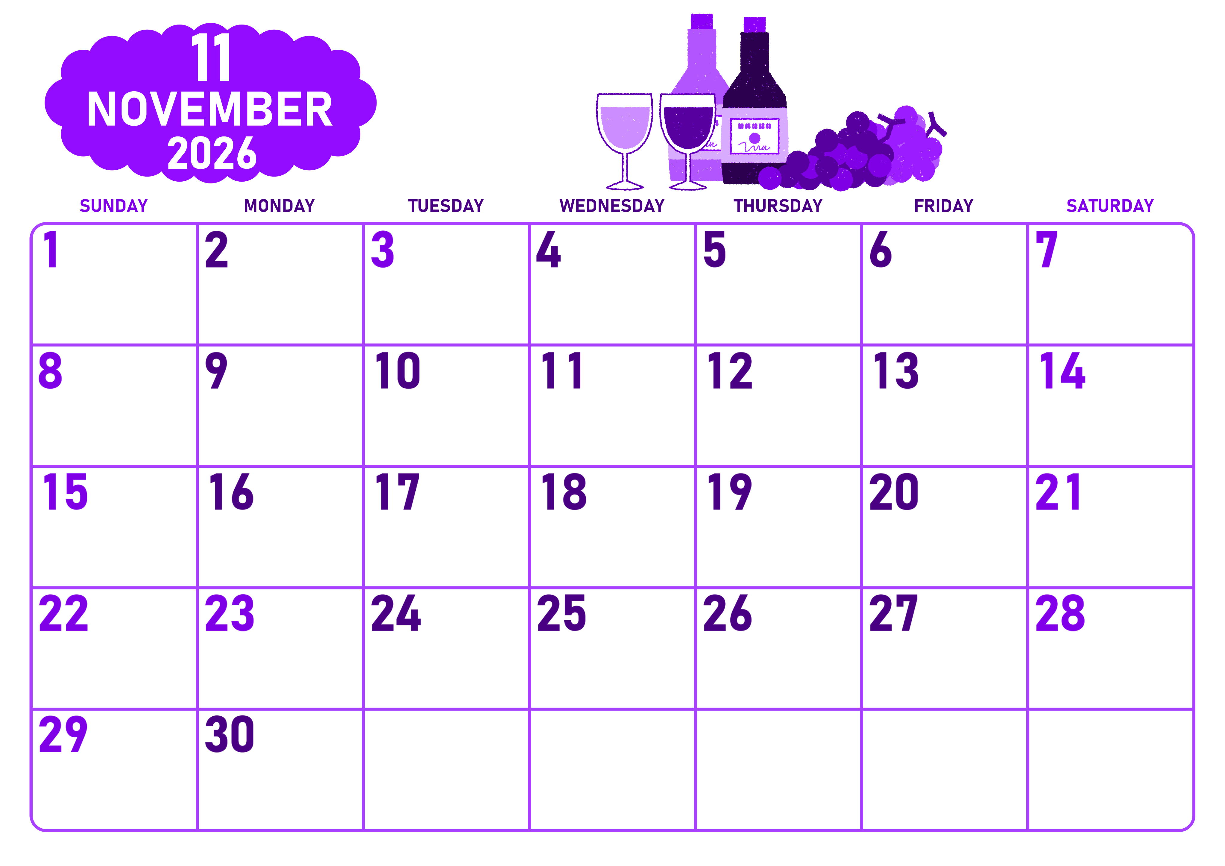 2026年11月横型日曜始まりの無料テンプレートパープルのカレンダーです。ぶどうのイラストがかわいいです。曜日毎にフォントの色分けがされているので見やすい実用性の高いコンテンツとなっています。(2026-01011100)
