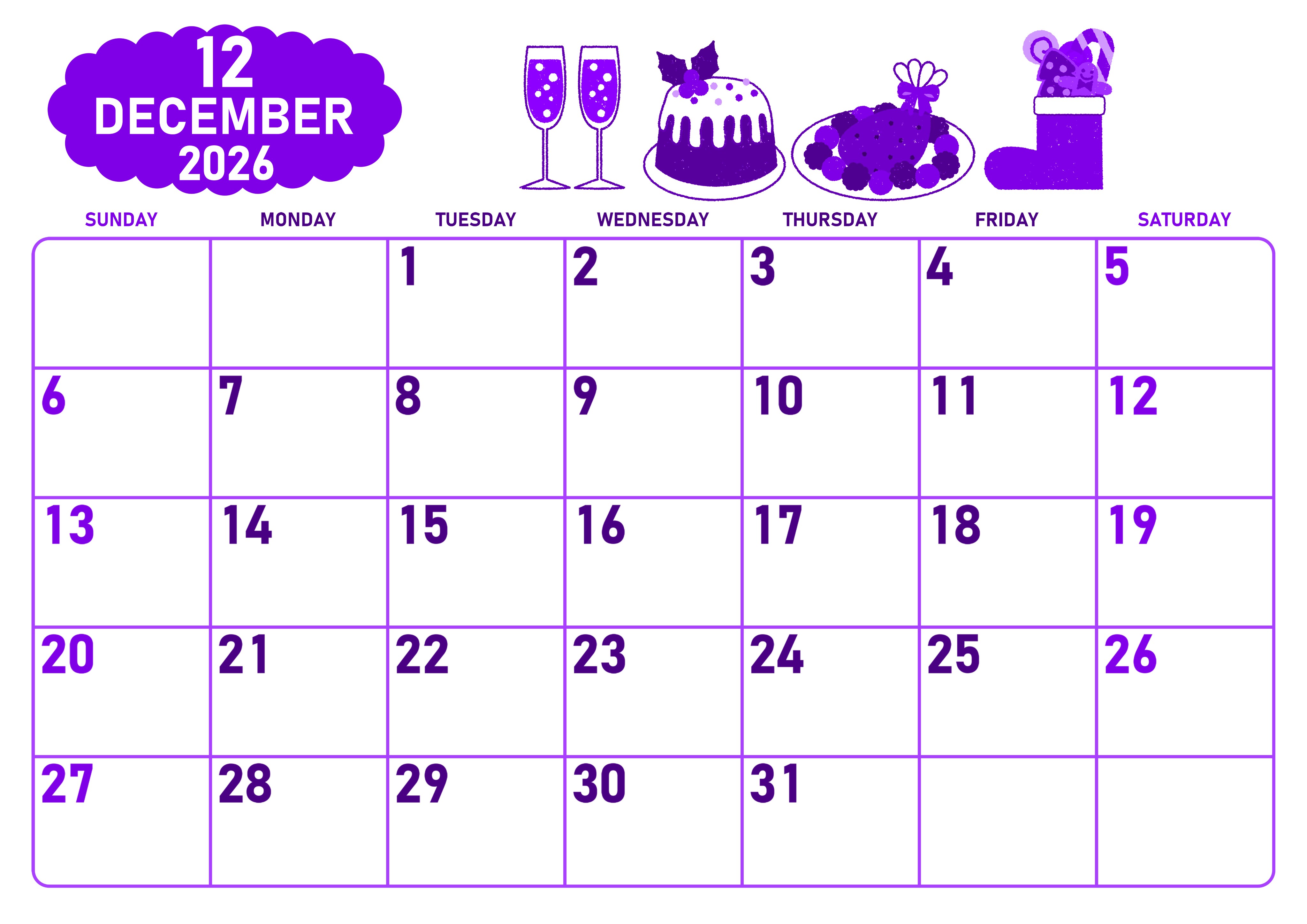 2026年・無料のカレンダーテンプレート 2026年12月横型日曜始まり 御馳走イラストのかわいいA4無料パープルのカレンダー(2026-01011200) 素材状デザイン王 2025年4月6日 2026年12月横型日曜始まりの無料テンプレートパープルのカレンダーです。クリスマスパーティーを連想させる豪華絢爛な御馳走がふんだんに並べられたイラストがかわいい食欲を刺激する素材となっています。(2026-01011200) 12月 横型のカレンダー 日曜始まり パープル カレンダーデザイン-0101