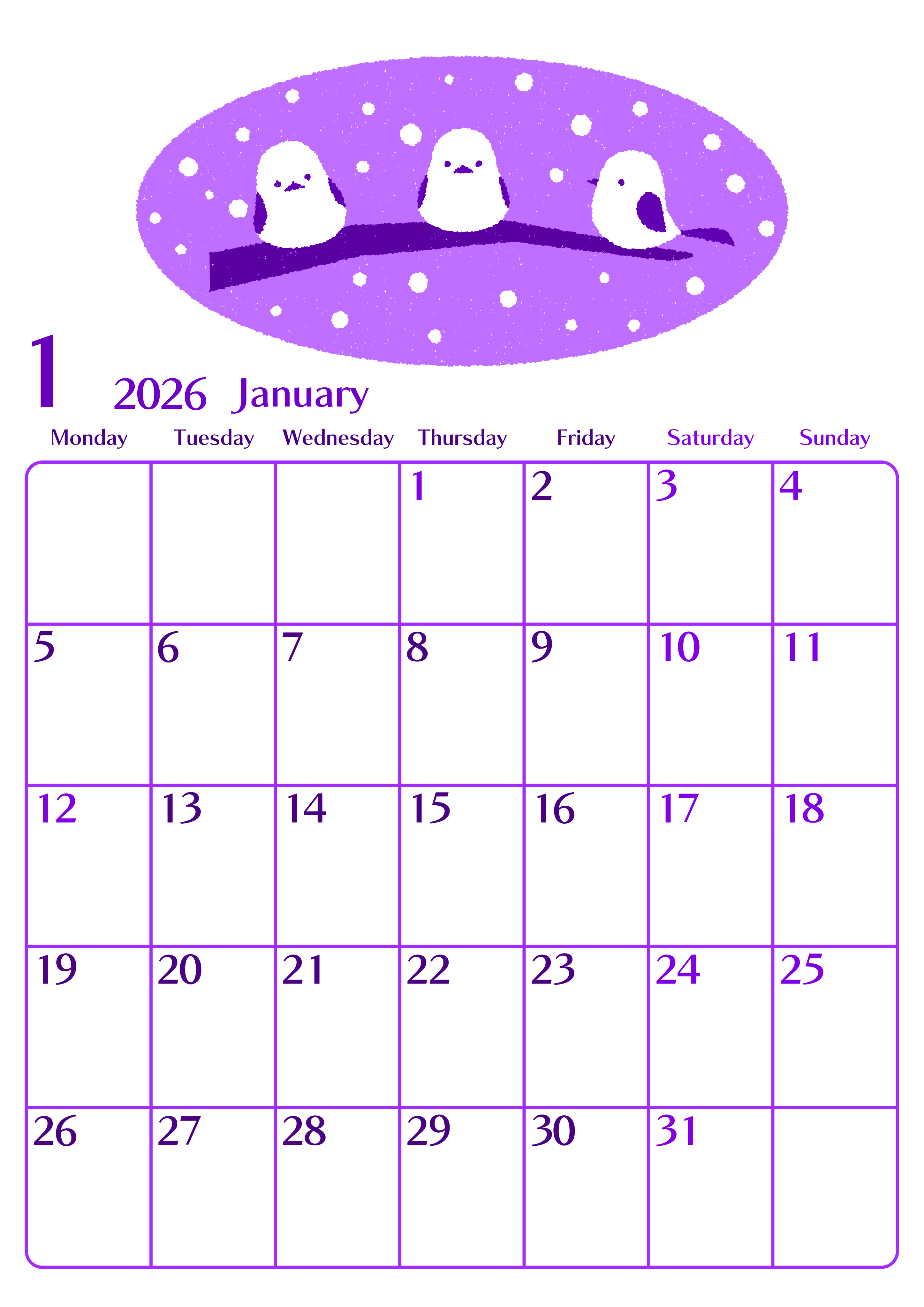 2026年・無料のカレンダーテンプレート 2026年1月縦型月曜始まり イラストのおしゃれA4無料パープルのカレンダー(2026-01020111) 素材状デザイン王 2025年4月6日 2026年1月縦型月曜始まりの無料テンプレートパープルのカレンダーです。新年のスタートダッシュを気持ちよく切れるようなスッキリ見やすいフリー素材です。(2026-01020111) 1月 縦型のカレンダー 月曜始まり パープル カレンダーデザイン-0102