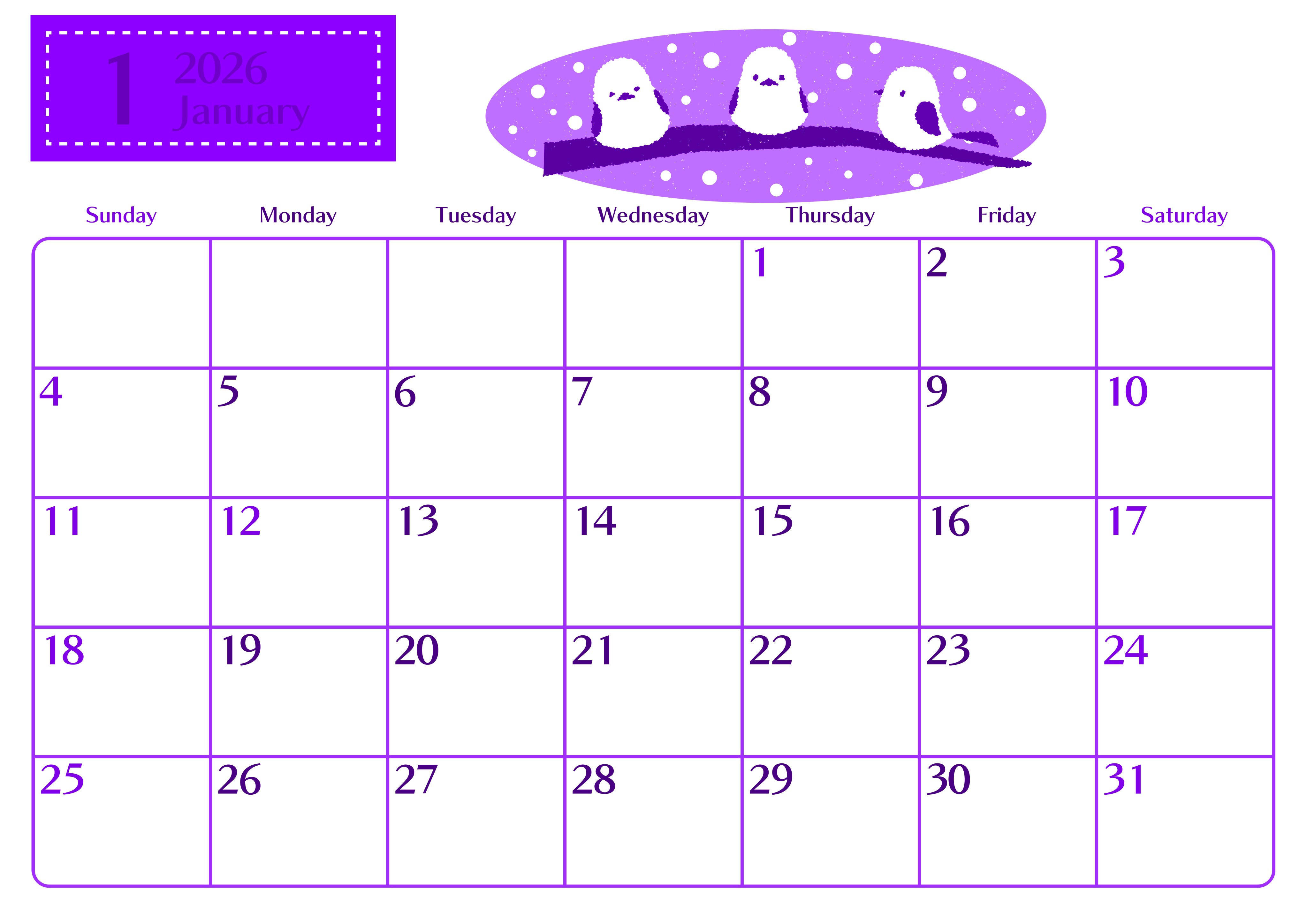 2026年1月横型日曜始まりの無料テンプレートパープルのカレンダーです。シマエナガの3兄弟が木にとまってぬくぬくと転寝をしているおしゃれなパープルのカレンダーです。すっきりとした見栄えなので使いやすいです。(2026-01020100)
