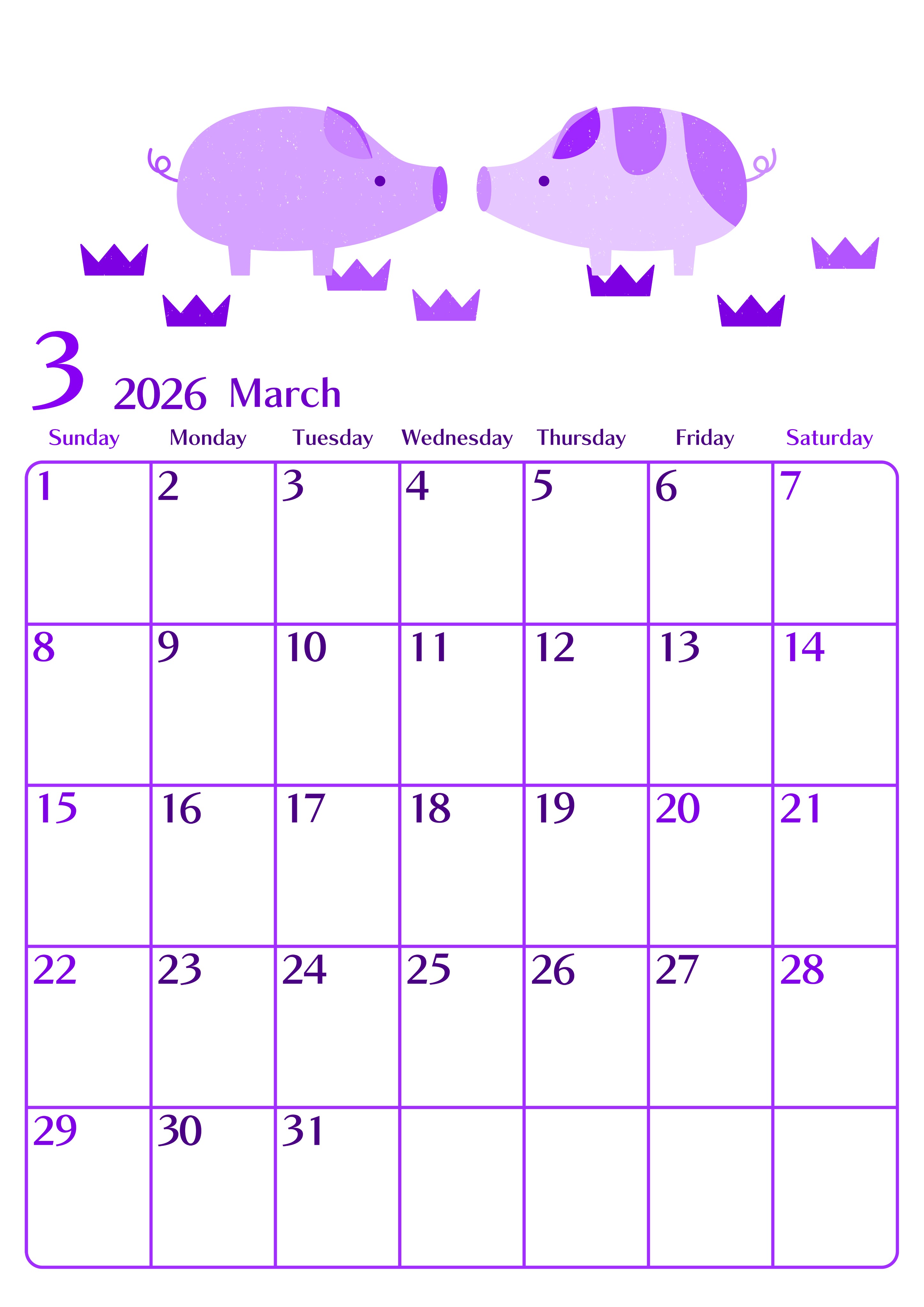 2026年3月縦型日曜始まりの無料テンプレートパープルのカレンダーです。癒し系な自然と動物をテーマにしたおしゃれですっきりとしたシンプルパープルのカレンダーです。書き込みしやすいレイアウトなのでおすすめします。(2026-01020310)