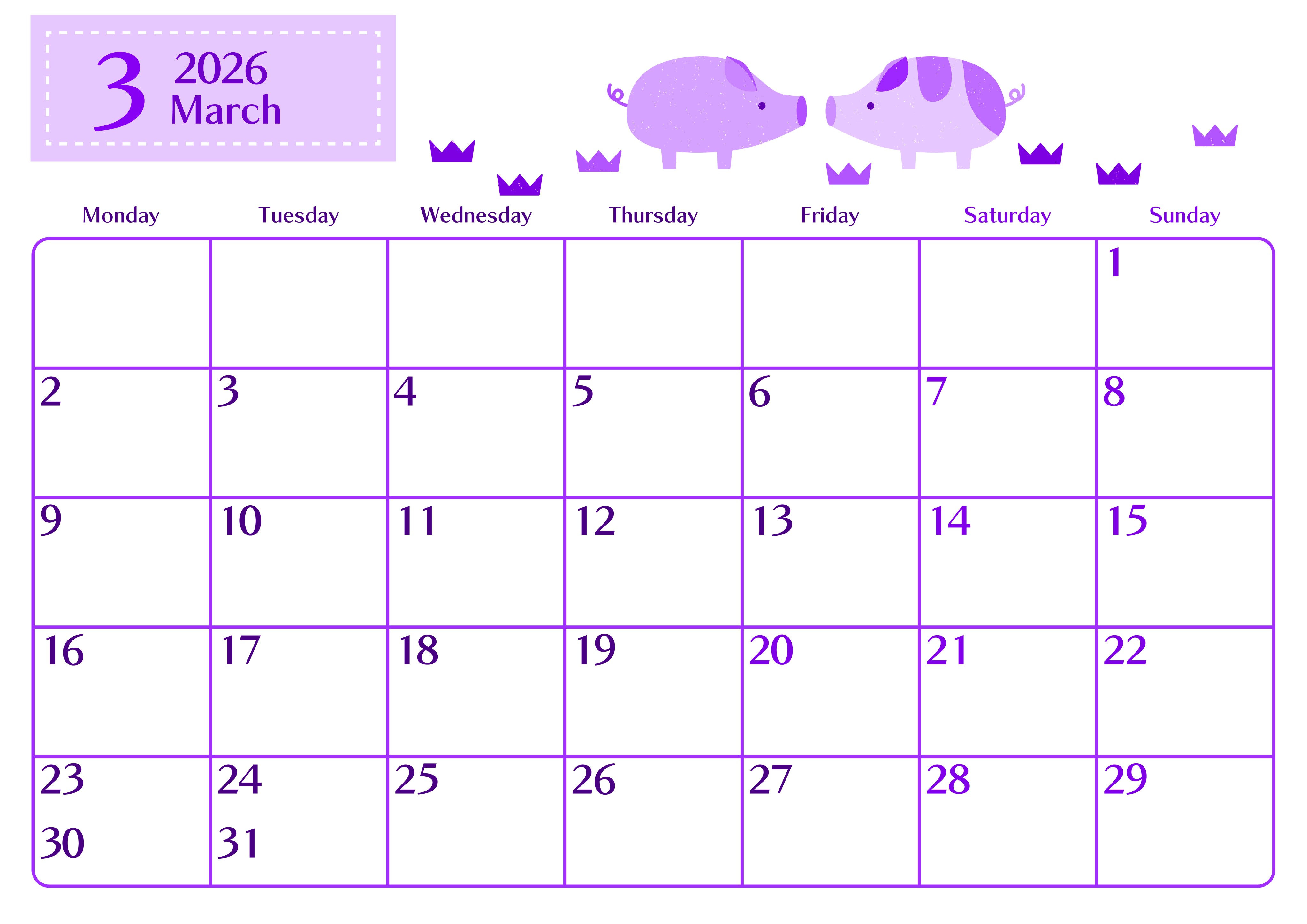 2026年3月横型月曜始まりの無料テンプレートパープルのカレンダーです。アニマルのイラストがふわふわとしていておしゃれな使っていて楽しくなるような予定を充実させることのできるパープルのカレンダーです。(2026-01020301)