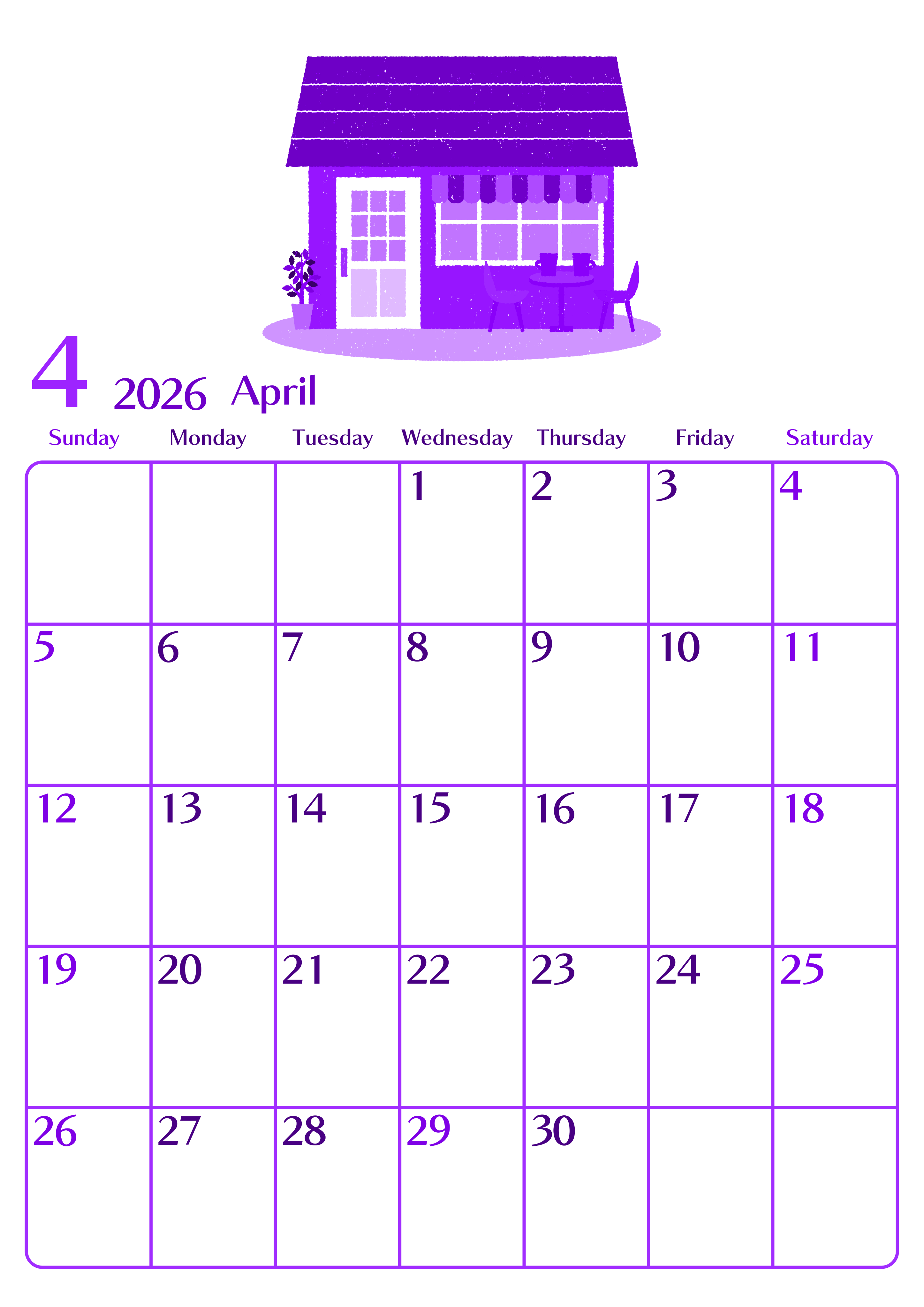 2026年4月縦型日曜始まり 新生活イラストのおしゃれA4無料パープルのカレンダー(2026-01020410)